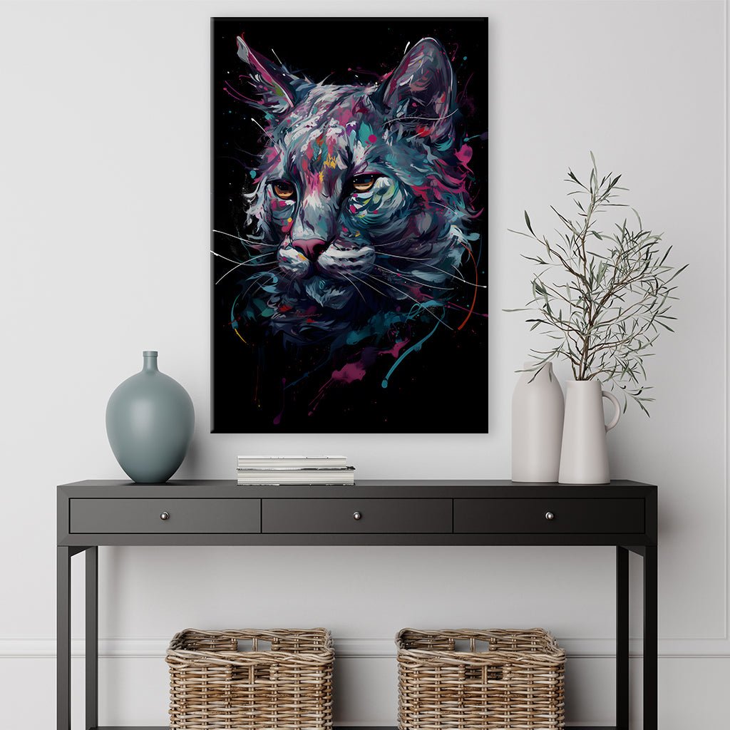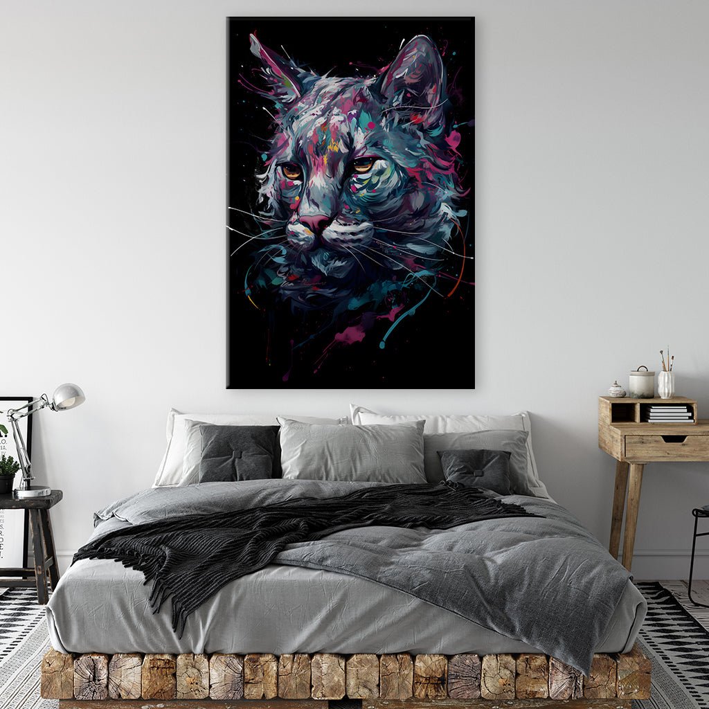 Viele kleine bunte Farbkleckse und Striche ergeben diesen tollen Luchs, der auf einem schwarzen Hintergrund zu sehen ist. Die vielen kleinen Farbkleckse ergeben ein einzigartiges Kunstwerk, das die Schönheit der Dame und die Kreativität des Künstlers auf wunderbare Weise vereint.