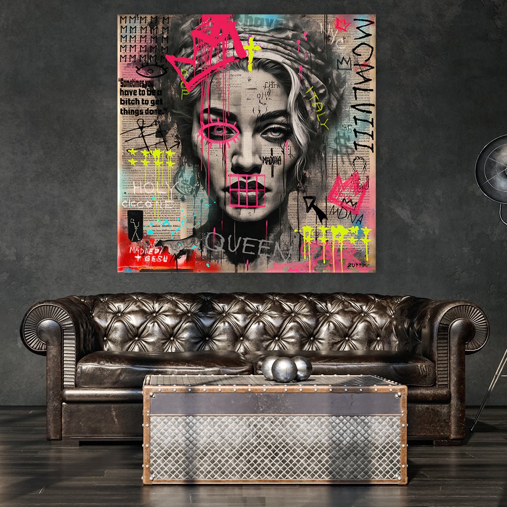 Das Bild zeigt ein ausdrucksstarkes, schwarz-weißes Porträt von Madonna, überlagert von lebhaften pinken und gelben Graffiti-Elementen, darunter eine zackige Krone und ein Zitat: "Sometimes you have to be a bitch to get things done". Der Hintergrund besteht aus collagierten Textfragmenten und weiteren Kritzeleien, die dem Werk eine rebellische und urbane Ästhetik verleihen.