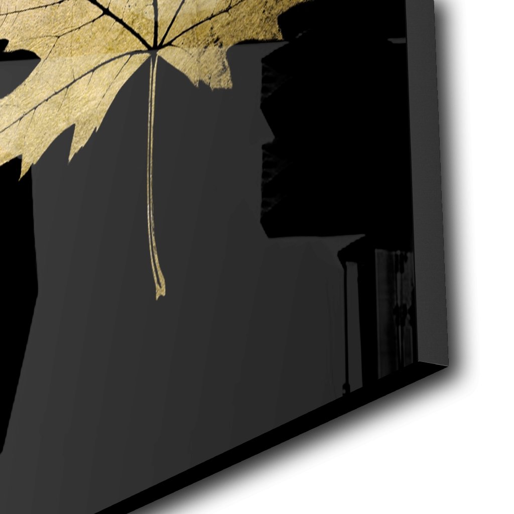 Das hochformatige Motiv "Maple Leaf" zeigt ein Ahornblatt aus Blattgold auf einem schwarzen Hintergrund durch dass da Gold noch mehr zur Geltung kommt. Das Gold wurde von Hand aufgelegt und und wirkt sehr edel und luxuriös.