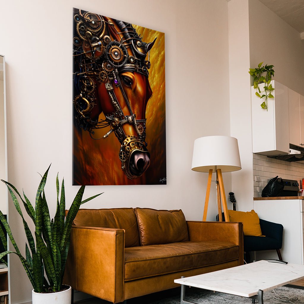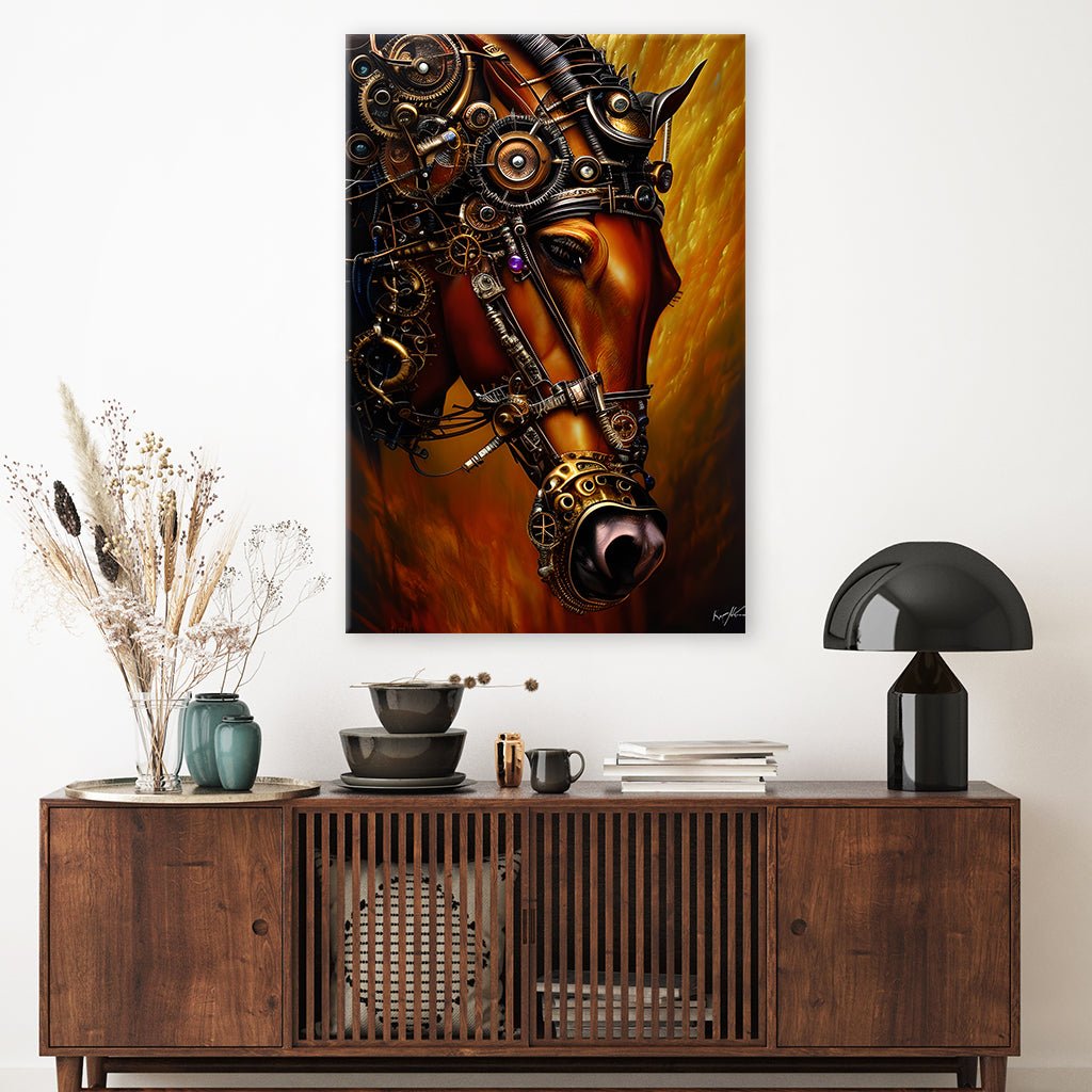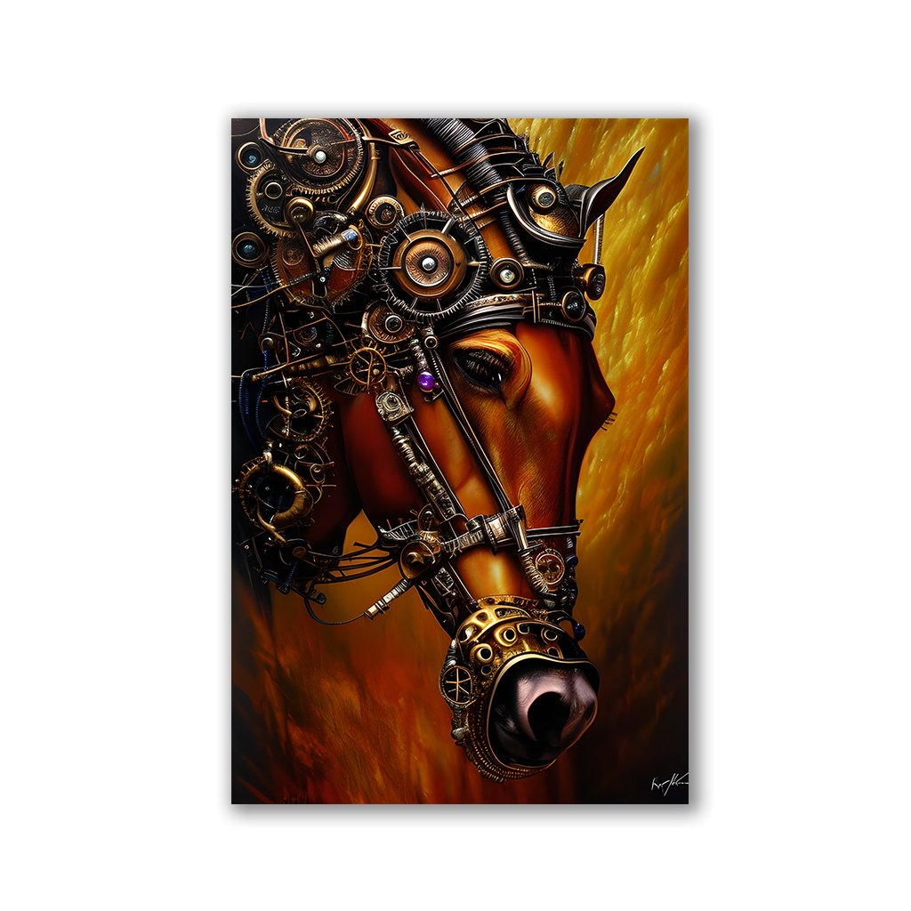 Ein Steampunk-Pferd wird zum faszinierenden Meisterwerk, dessen Rüstung von einem komplexen Uhrwerk mit Zahnrädern durchzogen ist. Diese künstlerische Verschmelzung von Technologie und Natur schafft eine einzigartige Ästhetik. Der Steampunk-Stil verleiht dem Pferd eine mechanische Eleganz, während das Uhrwerk mit seinen Zahnrädern eine hypnotische Bewegung darstellt.
