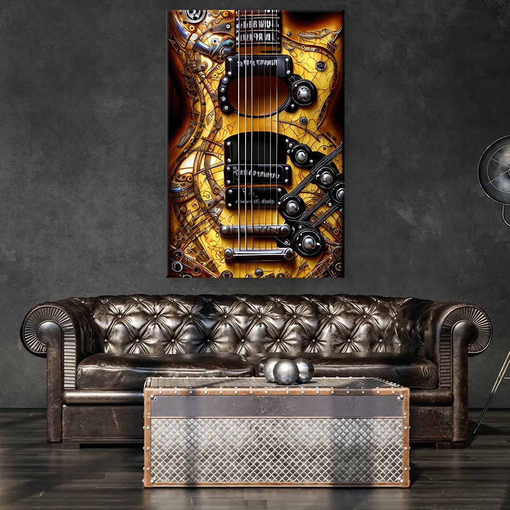 Eine E-Gitarre in einem warmen Gelbton erstrahlt in dieser Nahaufnahme des Korpus. Modern gestaltet, sind technische Elemente geschickt in das Design eingebunden. Diese einzigartige Verbindung aus Musikinstrument und moderner Technologie schafft eine faszinierende Ästhetik. Der warme Gelbton verleiht der Gitarre eine einladende Ausstrahlung.