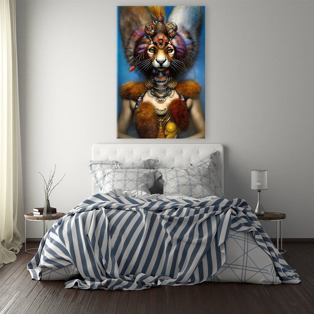 In diesem faszinierenden Motiv erlebst du die Metamorphose einer Frau, deren Kopf sich in den einer Wildkatze verwandelt hat. Es ist eine eindrucksvolle Darstellung des Übergangs und der Verschmelzung von Mensch und Tier. Auf den Schultern der Frau befinden sich kunstvoll gestaltete Fellbesätze, die das Motiv mit einem Hauch von Wildheit und Anmut umgeben. Der Blick der Frau, der direkt in die Kamera gerichtet ist, fesselt den Betrachter und lädt dazu ein, die Schönheit und den Zauber dieser Metamorphose zu erforschen.