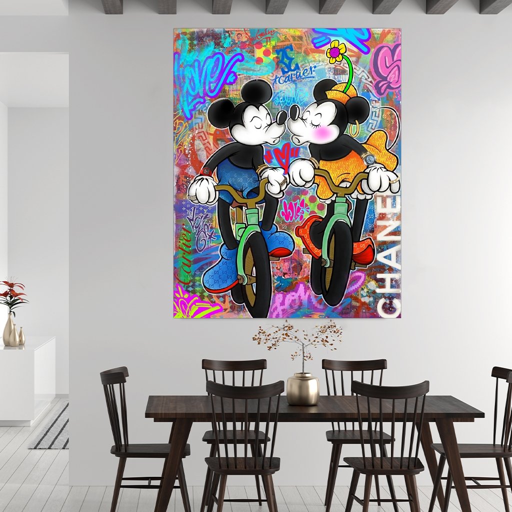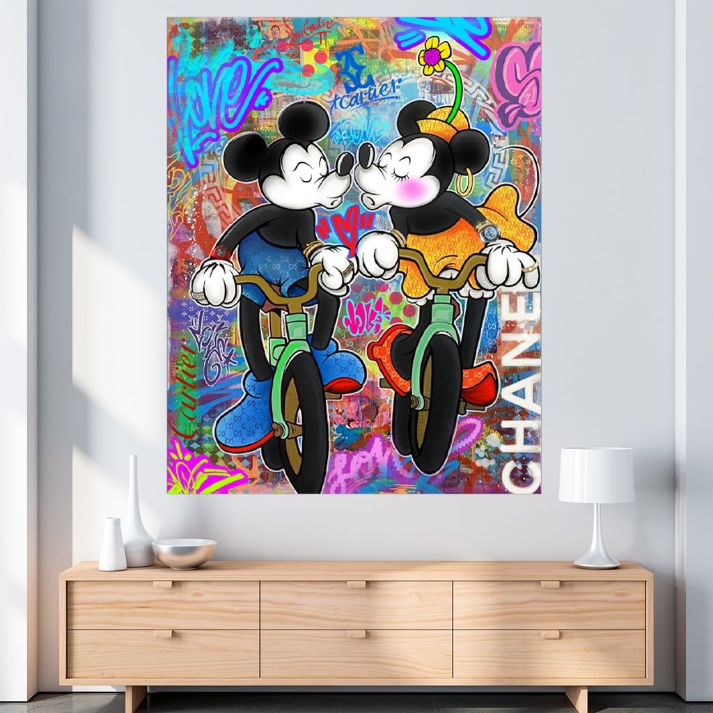 Mickey in love mit seiner geliebten Minnie. Das Traumpaar schlechthin im farbenfrohen Grafitti Stil mit bekannten Logos von Luxusmarken wie Chanel und Cartier im Hintergrund und Luxusuhren und edlen Goldringen. Ein außergewöhlicher Blickfang sowohl wegen den Farben als auch wegen der malerischen Umsetzung des Mouse-Duos.