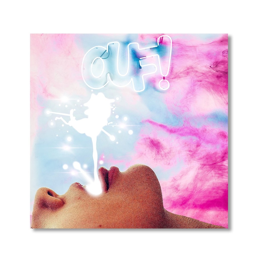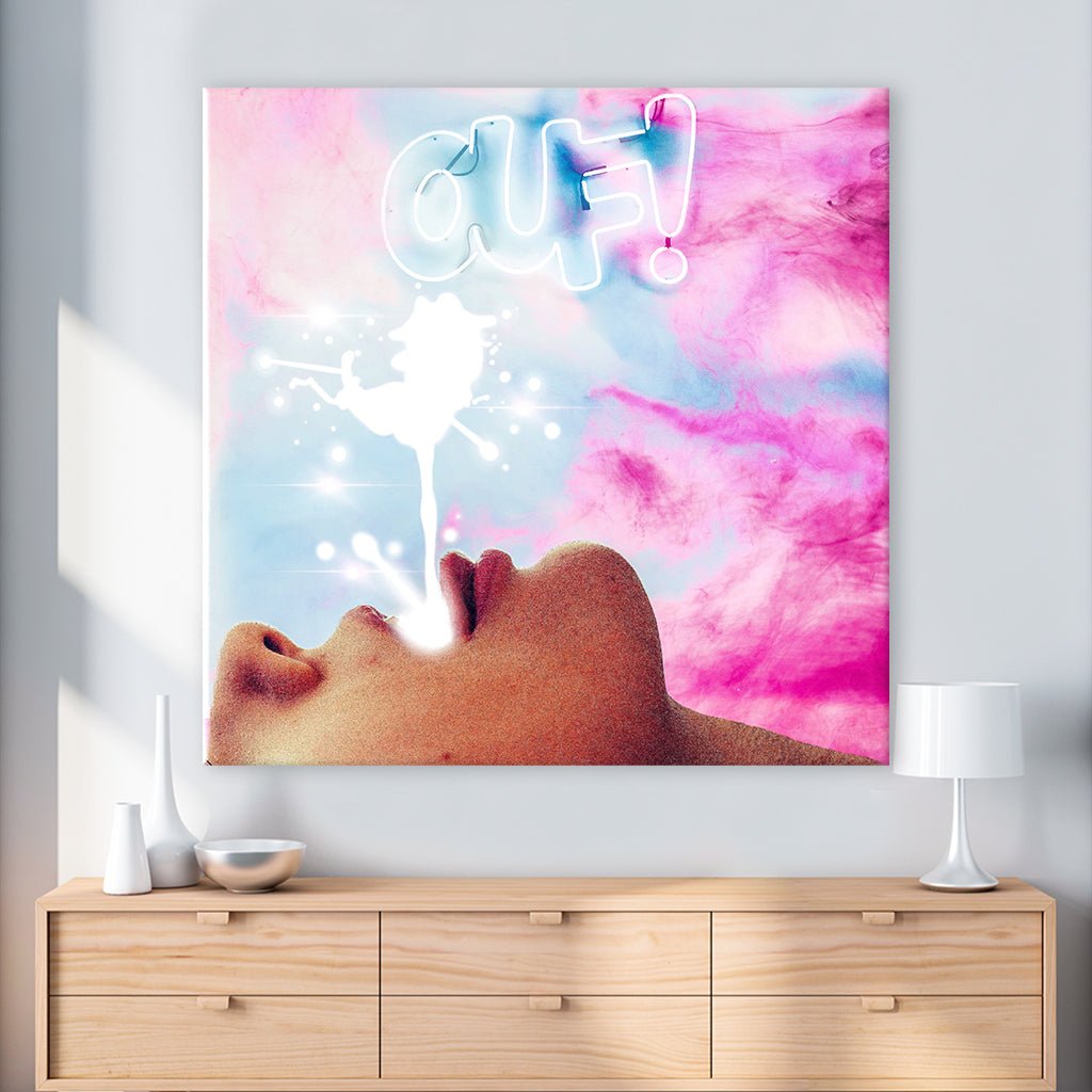 Das Bild zeigt einen geöffnete Lippen einer Frau die ihre Zunge nach einem Schluck Milch herausstreckt. Darüber der Schriftzug im dezenten Neonstil "OUF!". Der Hintergrund gleich einem Himmel aus rosa Wolken. Ein außergewöhnlicher Blickfang für dein Schlafzimmer, Wohnzimmer, Büro oder Flur.
