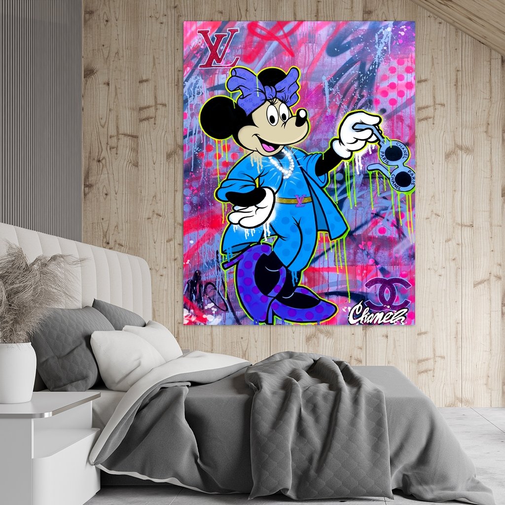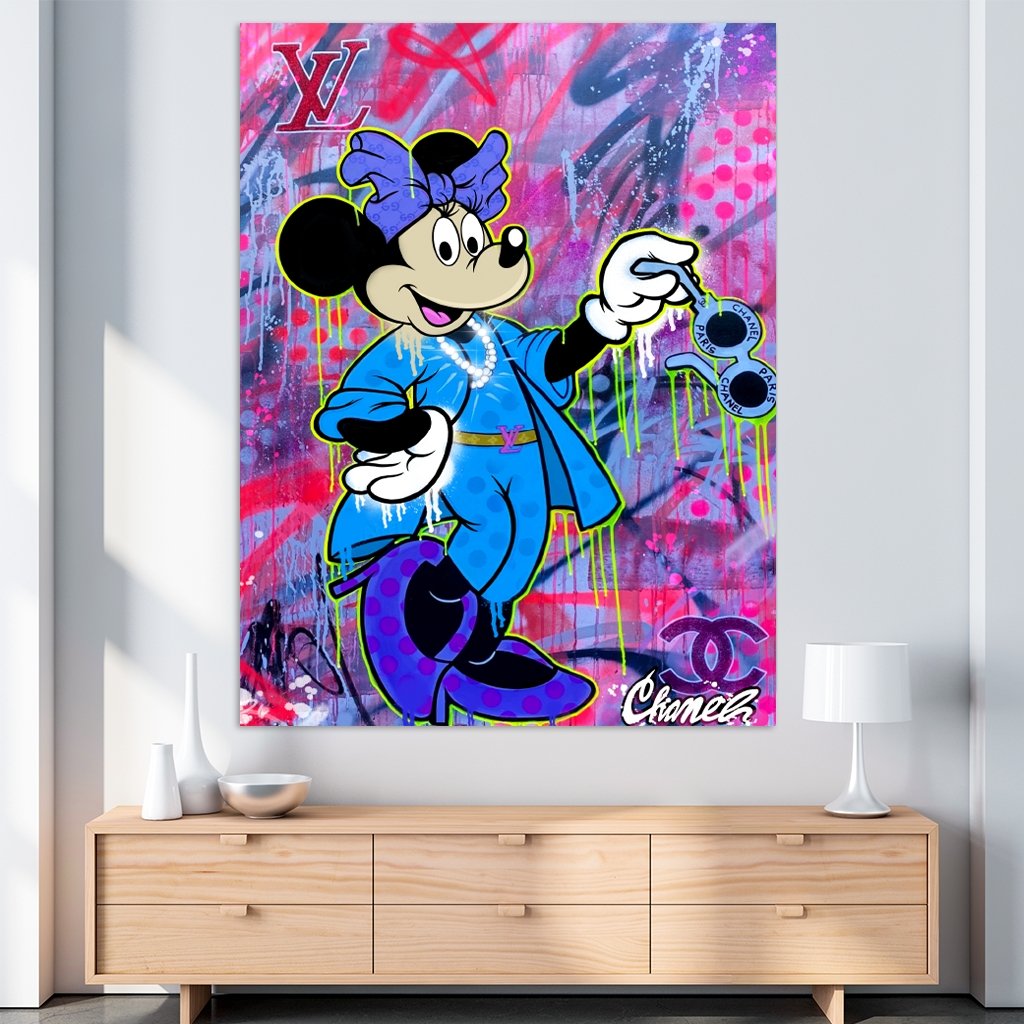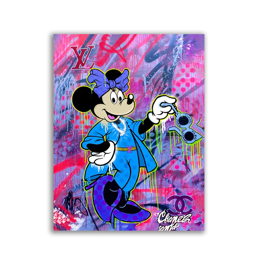 Die liebe Minnie Mouse wie man sie sonst nicht kennt. Modisch gekleidet mit exklusiven Accessoires der Marken Louis Vuitton und Chanel. Unser Minnie ist perfekt in abstrakt in Szene und die Farbtöne Lila, Pink und Blau sind ein echter Blickfang.