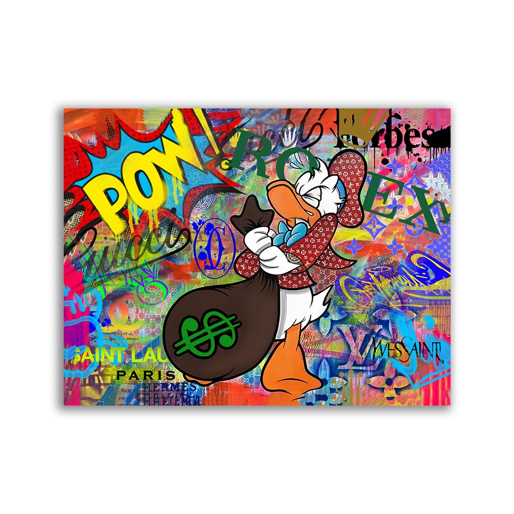 Donald Duck zieht einen großen, schweren Geldsack und man sieht ihm an dass viele Münzen darin sein müssen. Eingekleidet in Luxustextextilien von Louis Vuitton und einer Luxusuhr am Handgelenk ist er in bunten Farben und auf einem Graffiti Hintergrund abgebildet.