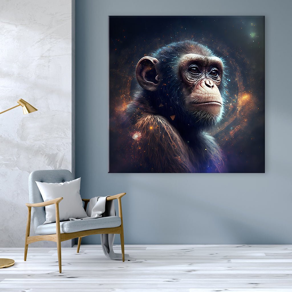 Cette image impressionnante présente le portrait d'un majestueux chimpanzé, le regard tourné vers l'immensité de l'univers. Le noir profond de l'espace est ponctué d'étoiles scintillantes. Une œuvre d'art qui unit la beauté et la fascination du règne animal à l'étendue infinie de l'univers.