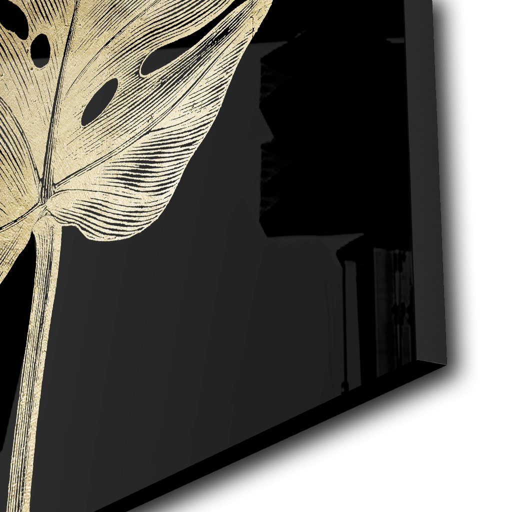 Das Blattgold, welches auf die Acryloberfläche aufgetragen wurde, verleiht dem Kunstwerk einen edlen und luxuriösen Touch. Es schimmert und glänzt in der Sonne und erzeugt eine beeindruckende Wirkung. Das goldene Blatt der Monstera Pflanze steht im starken Kontrast zum schwarzen Hintergrund und sorgt so für eine besondere Aufmerksamkeit.