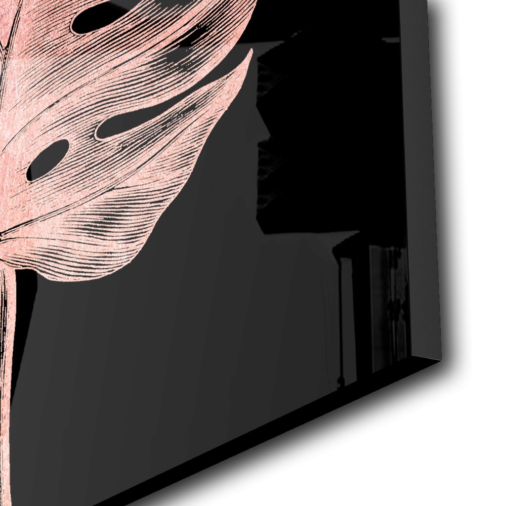 Das Roségold, welches auf die Acryloberfläche aufgetragen wurde, verleiht dem Kunstwerk einen edlen und luxuriösen Touch. Es schimmert und glänzt in der Sonne und erzeugt eine beeindruckende Wirkung. Das roséfarbene Blatt der Monstera Pflanze steht im starken Kontrast zum schwarzen Hintergrund und sorgt so für eine besondere Aufmerksamkeit.