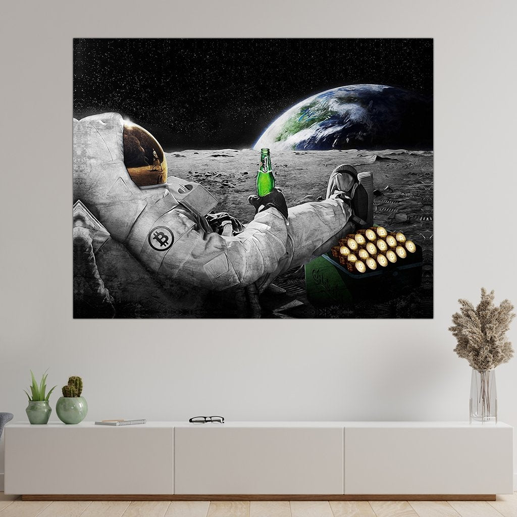 Wer auch immer gesagt hat, "Der Himmel ist die Grenze", hat offensichtlich nicht in Kryptowährungen investiert. Das Motiv Moon Rockin wurde durch das unbeschreibliche Gefühl inspiriert, mit der richtigen Investition das große Los zu ziehen. Manche würden sagen, das Gefühl ist nicht von dieser Welt. Auf diesem Bild sitz ein Astronaut mit einer Flasche Bier und Kryptowährung neben sich auf dem Mond und schaut auf die Erde herunter.