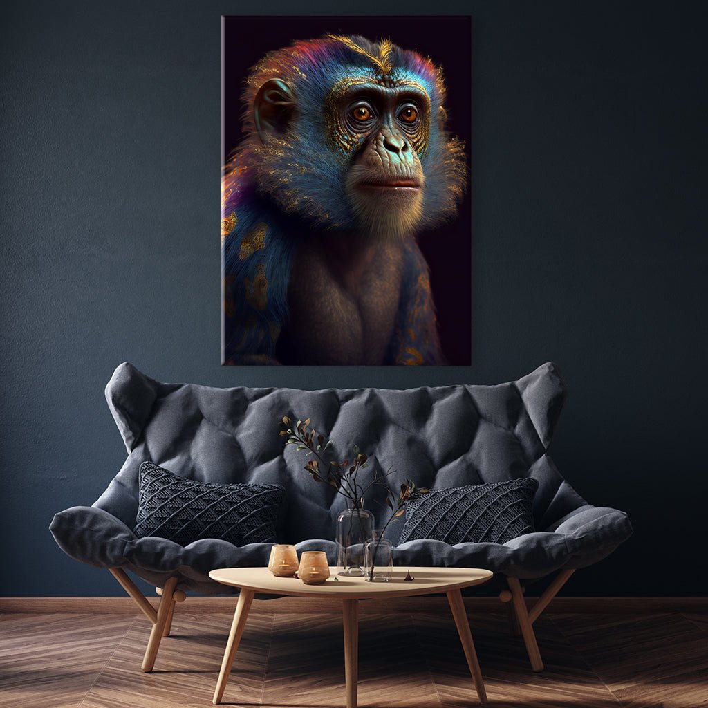 Der kleine Affe ist wahrhaftig mystisch anzusehen. Sein Fell schimmert in einem geheimnisvollen Farbspektrum aus Blau und Lila, teilweise durchsetzt von goldenem Fell. Seine Augen scheinen tief in die Seele zu blicken und seine Anwesenheit ist von einer rätselhaften Aura umgeben.