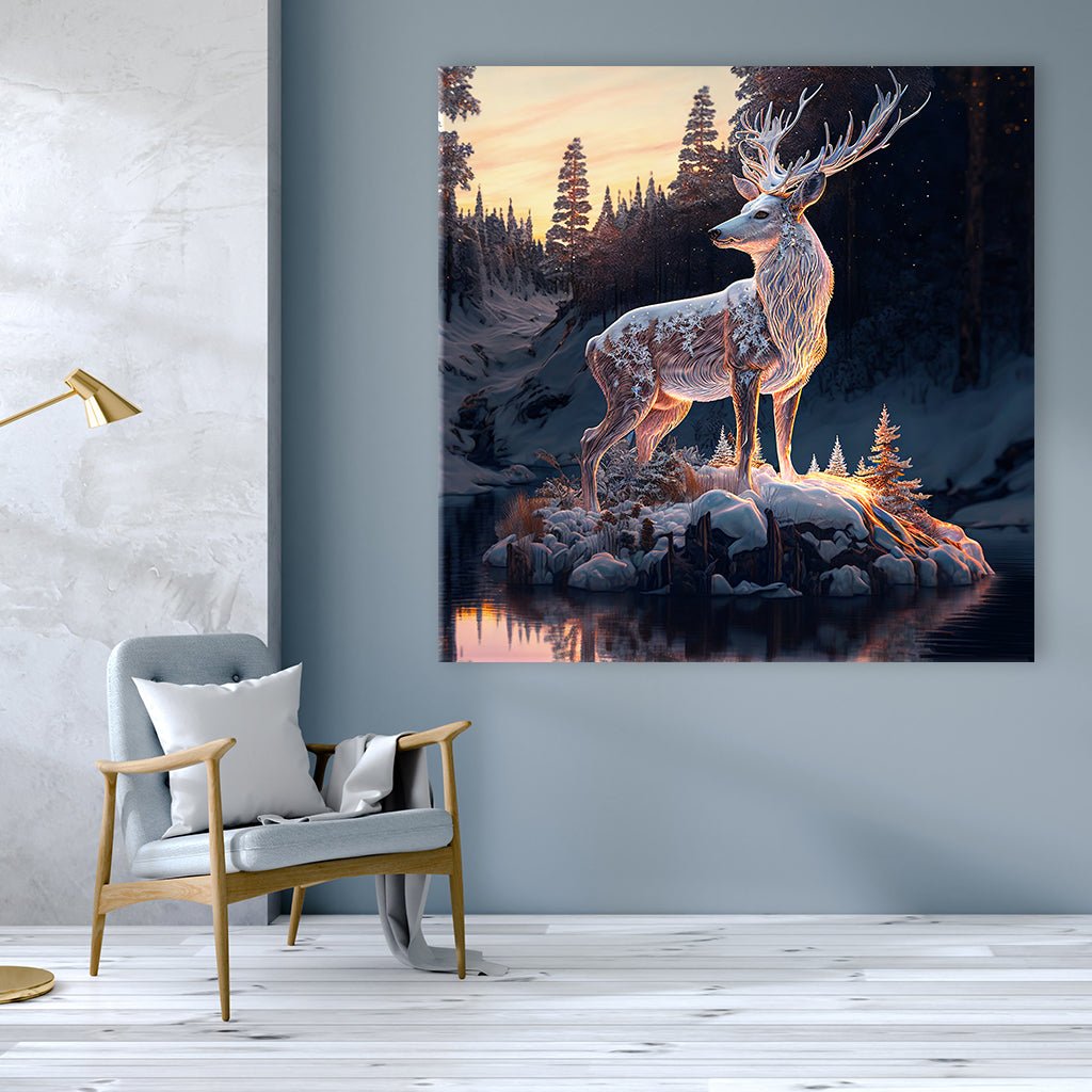 Mitten auf einer Insel auf einem See in Winterlandschaft thront ein majestätischer Hirsch. Eine Schneedecke bedeckt seinen Rücken und sein Geweih scheint wie aus Eis zu sein. Diese einzigartige Szene im winterlichen Ambiente verleiht dem Hirsch eine Aura der Erhabenheit und voller Geheimnisse. Die ruhige Schönheit des Sees und die Kälte des Winters verschmelzen mit der Anmut des Hirsches zu einem faszinierenden Anblick.