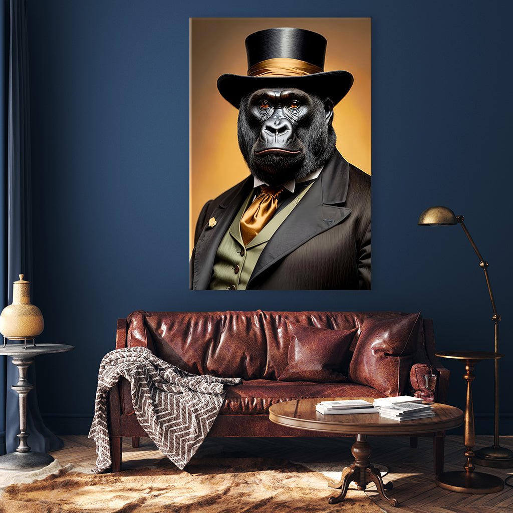 Ein Gorilla in einem maßgeschneiderten noblen Anzug und passendem Hut, gekleidet wie ein eleganter Herr. Seine dunkel gelbe Krawatte sowie sein Stoffband um seinen Hut bilden mit dem dezent gelblichen Hintergrund ein harmonsiches und edles Bild voller Eleganz, Anmut und Stärke.