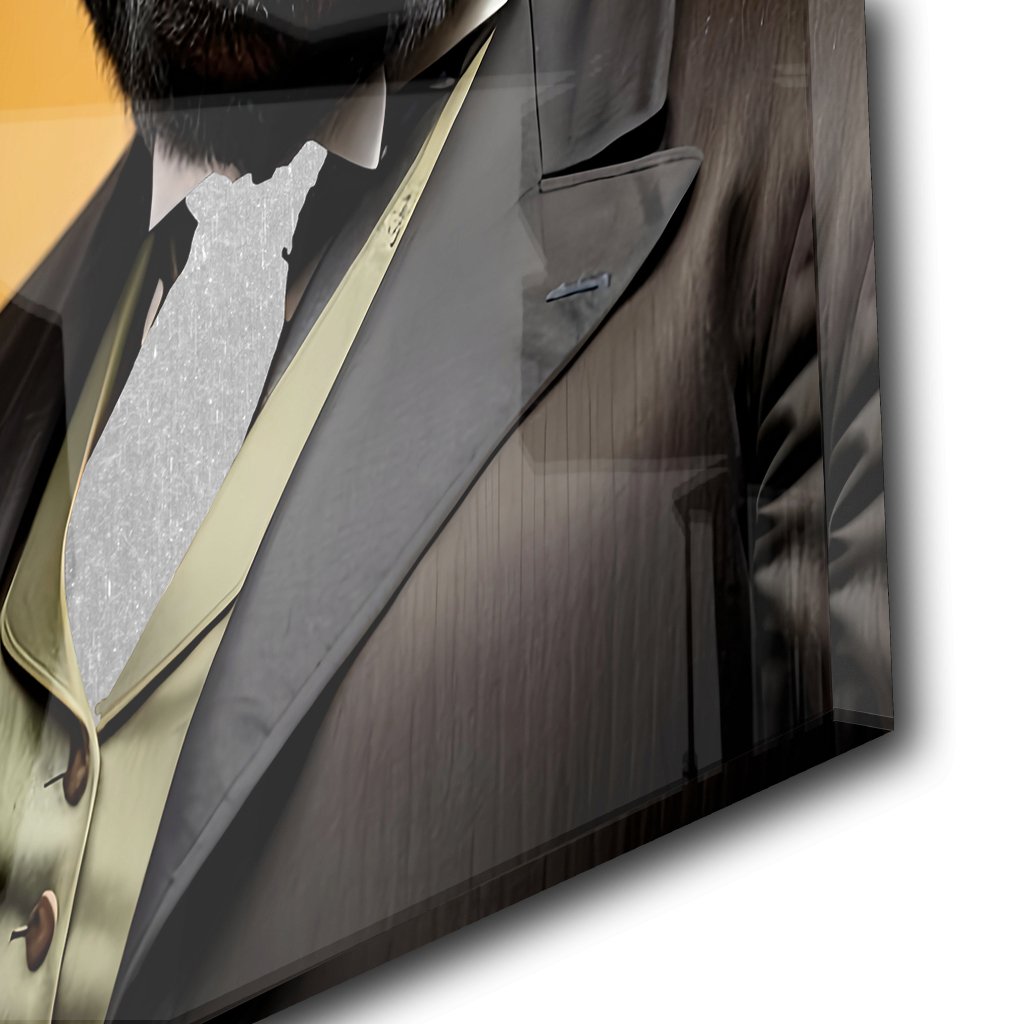Ein Gorilla in einem maßgeschneiderten noblen Anzug und passendem Hut, gekleidet wie ein eleganter Herr. Seine Krawatte sowie sein Stoffband um seinen Hut wurden mit Blattsilber versehen und bilden mit dem dezent gelblichen Hintergrund ein harmonsiches und edles Bild voller Eleganz, Anmut und Stärke.