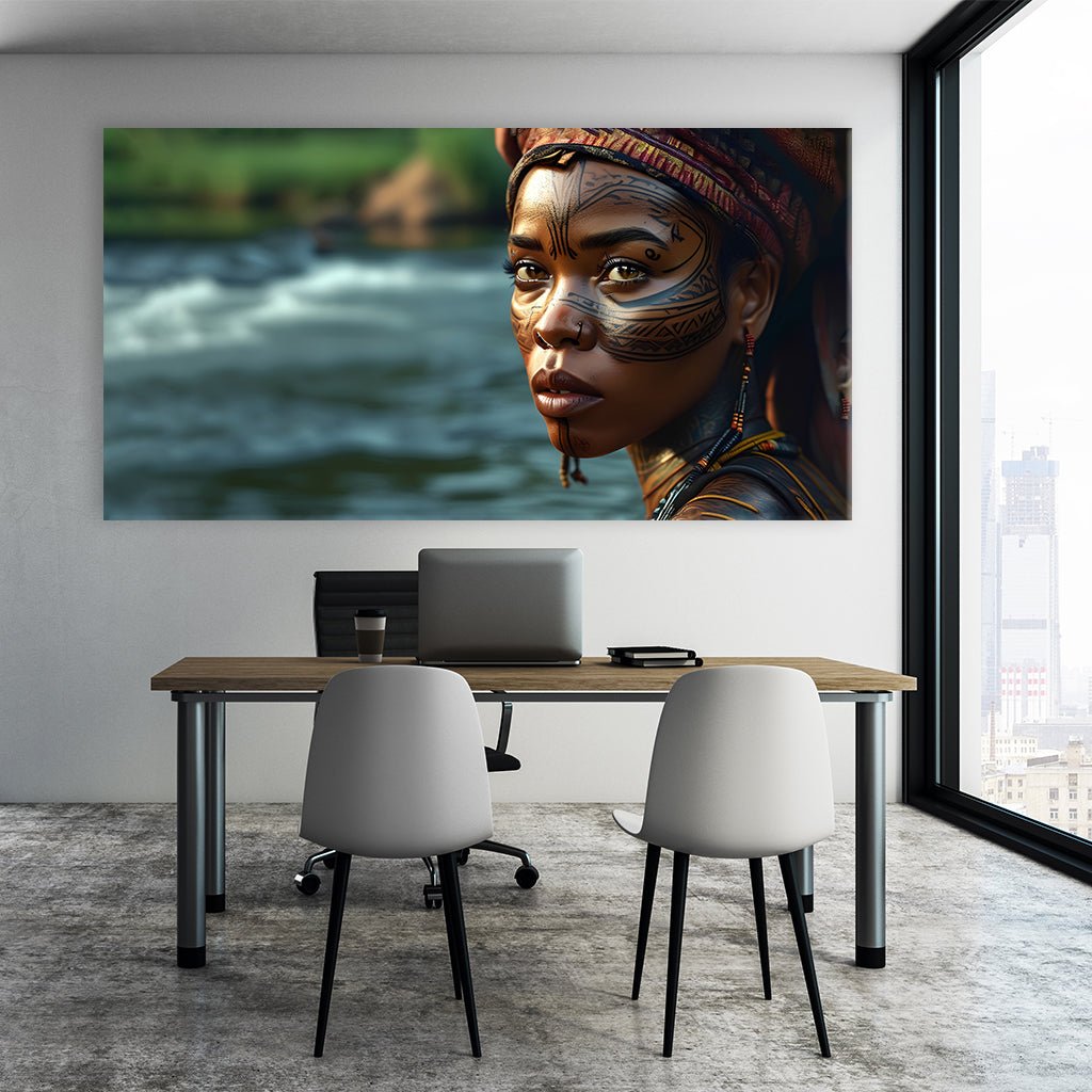 Nahaufnahme einer jungen Frau mit dunkler Haut die mit traditionellen Mustern bemalt ist, die an Stammesbemalung erinnern. Sie trägt eine Kopfbedeckung, die ihr Haar bedeckt, und mehrere Halsketten mit bunten Perlen. Ihr Blick ist ernst und fokussiert, direkt in die Kamera. Der Hintergrund ist unscharf und zeigt ein Flussufer.