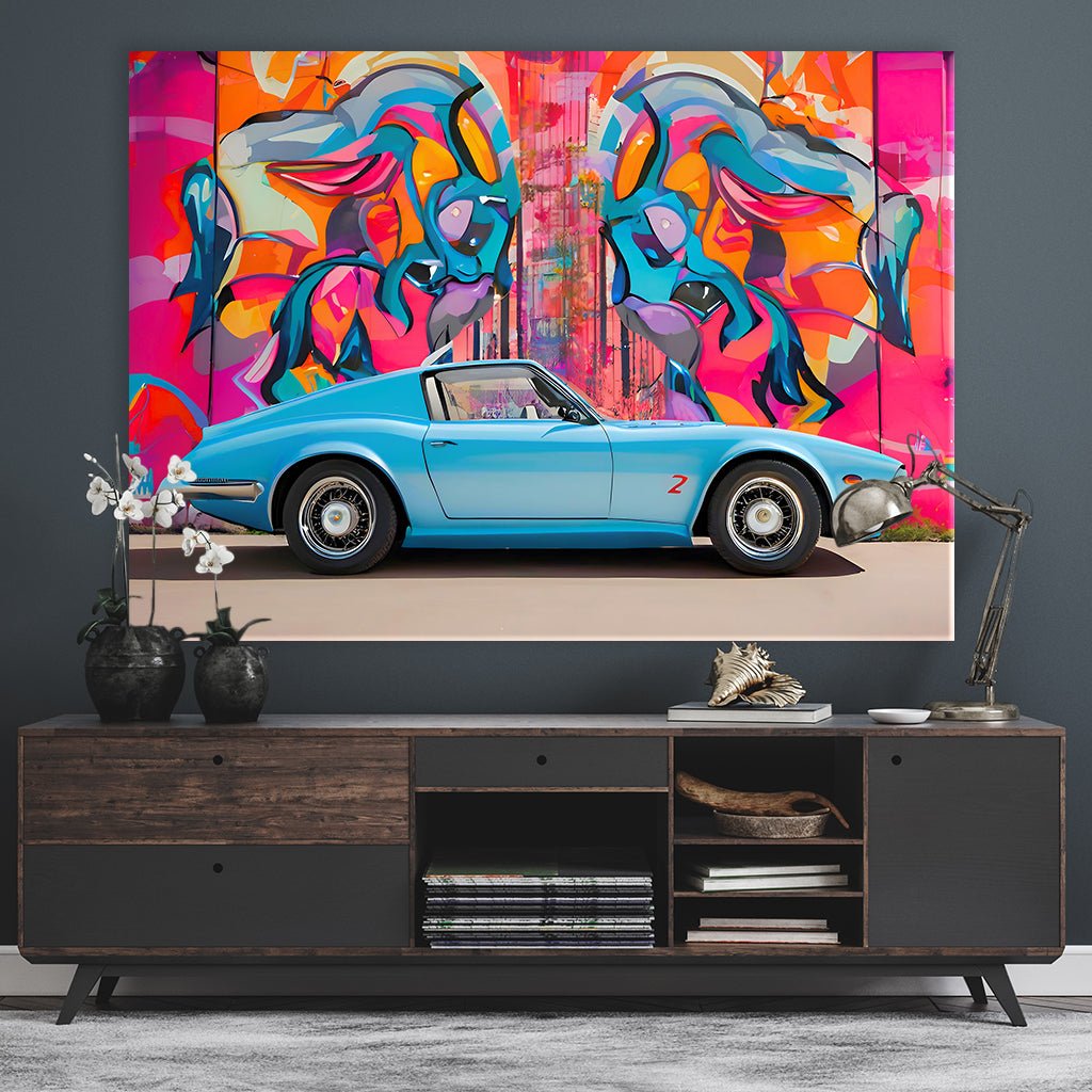 Das Bild zeigt einen klassischen Oldtimer in einem leuchtenden Hellblau, der vor einer auffälligen und farbenfrohen Streetart-Wand geparkt ist. Die Wandkunst besteht aus dynamischen, abstrakten Formen in lebendigen Farben wie Pink, Orange, Blau und Violett, die dem Bild eine energiegeladene und moderne Atmosphäre verleihen. Die Kombination aus dem klassischen Fahrzeug und der lebhaften Streetart vermittelt eine einzigartige Verschmelzung von Vergangenheit und Gegenwart.