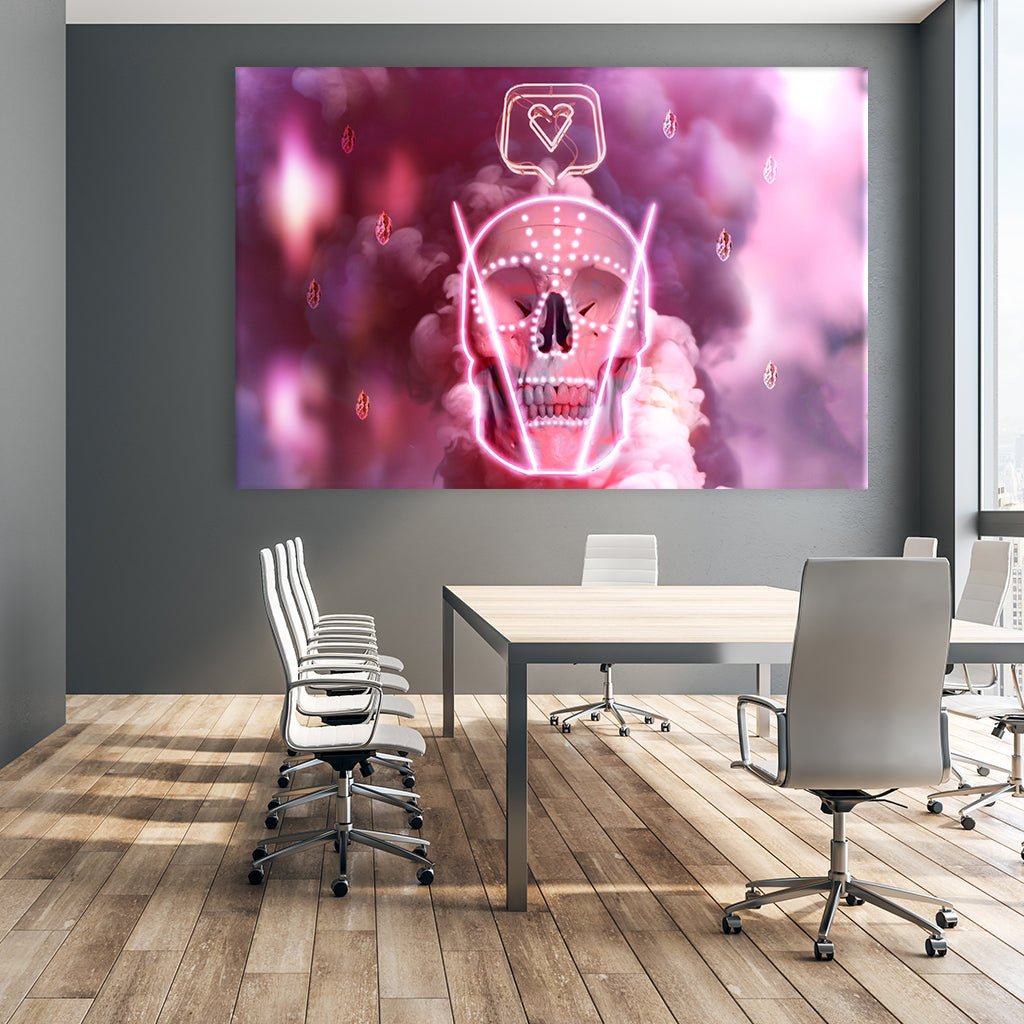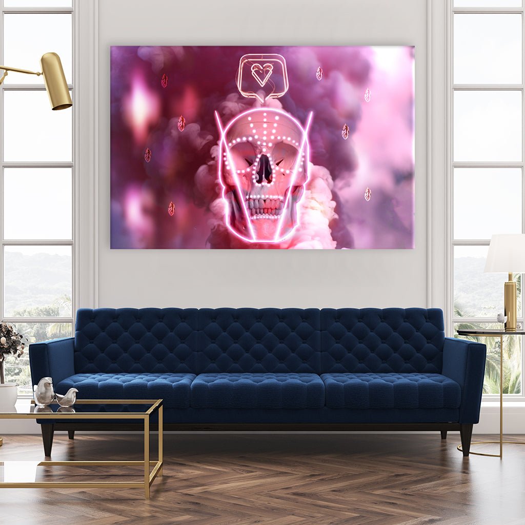 Dieses rosa gehaltene Motiv zeigt einen Totenschädel mit einen Like-Herz darüber. Ein Statement den man sich ab und zu zu Herzen nehmen darf und zum Nachdenken anregt. Hervorgehoben im Neonstil ist dieses Bild ein außergewöhnlicher Hingucker für dein Schlafzimmer, Wohnzimmer, Büro oder Flur.