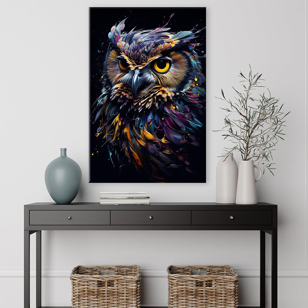 Viele kleine bunte Farbkleckse und Striche ergeben dieser tollen Eule, die auf einem schwarzen Hintergrund zu sehen ist. Die vielen kleinen Farbkleckse ergeben ein einzigartiges Kunstwerk, das die Schönheit der Dame und die Kreativität des Künstlers auf wunderbare Weise vereint.