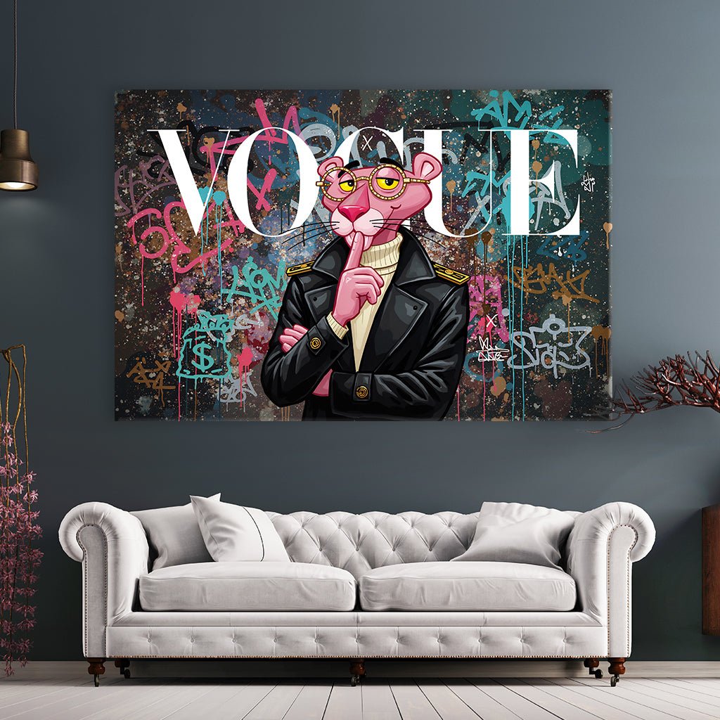 Dieses Bild zeigt einen elegant gekleideten Pink Panther vor einen bunten, chaotischen Graffiti Hintergrund. Es hat eine Anmutung von Modezeitschriften und Popkultur, die sich durch den Titel VOGUE verstärkt.