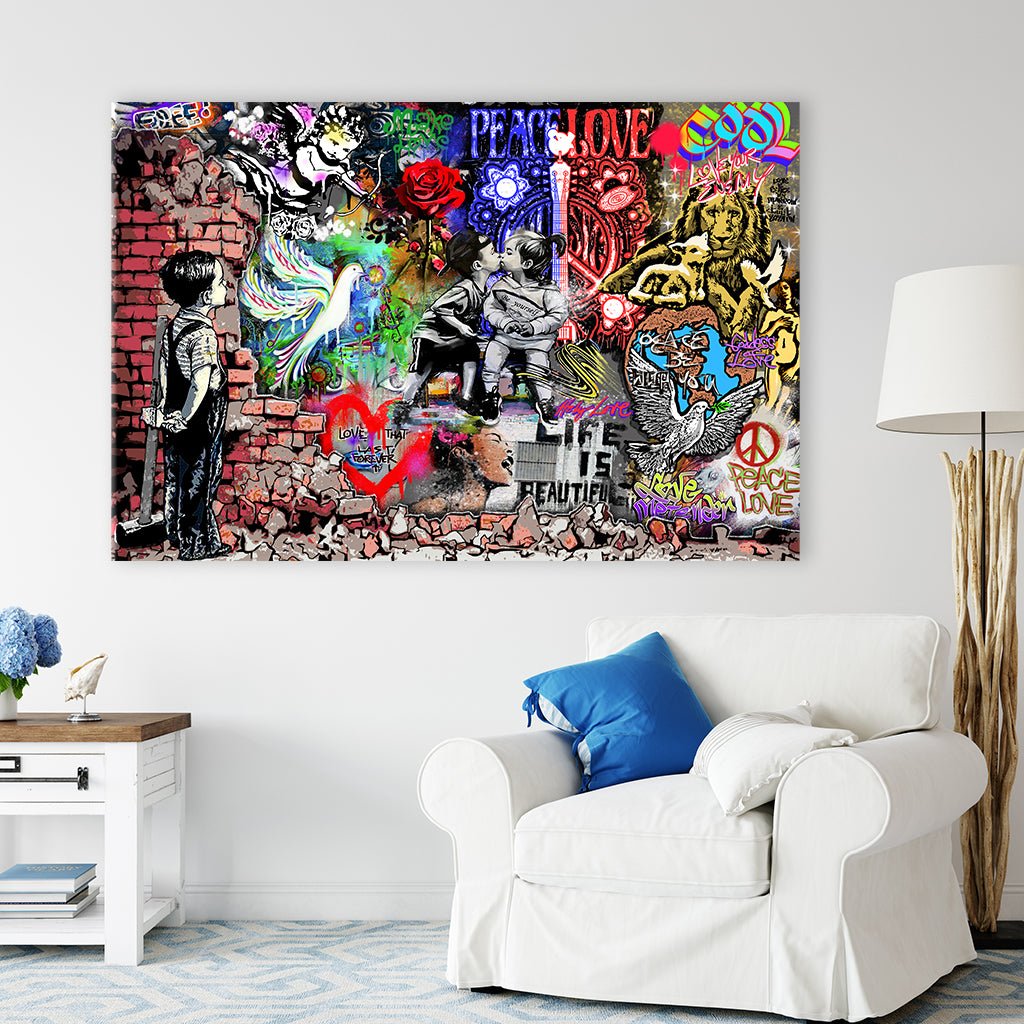 Eine Collage verschiedener Motive des bekannten StreetAt-Künstlers Banksy in einem wundervoll umgesetzten Bild, in dem es um Liebe und Frieden geht.