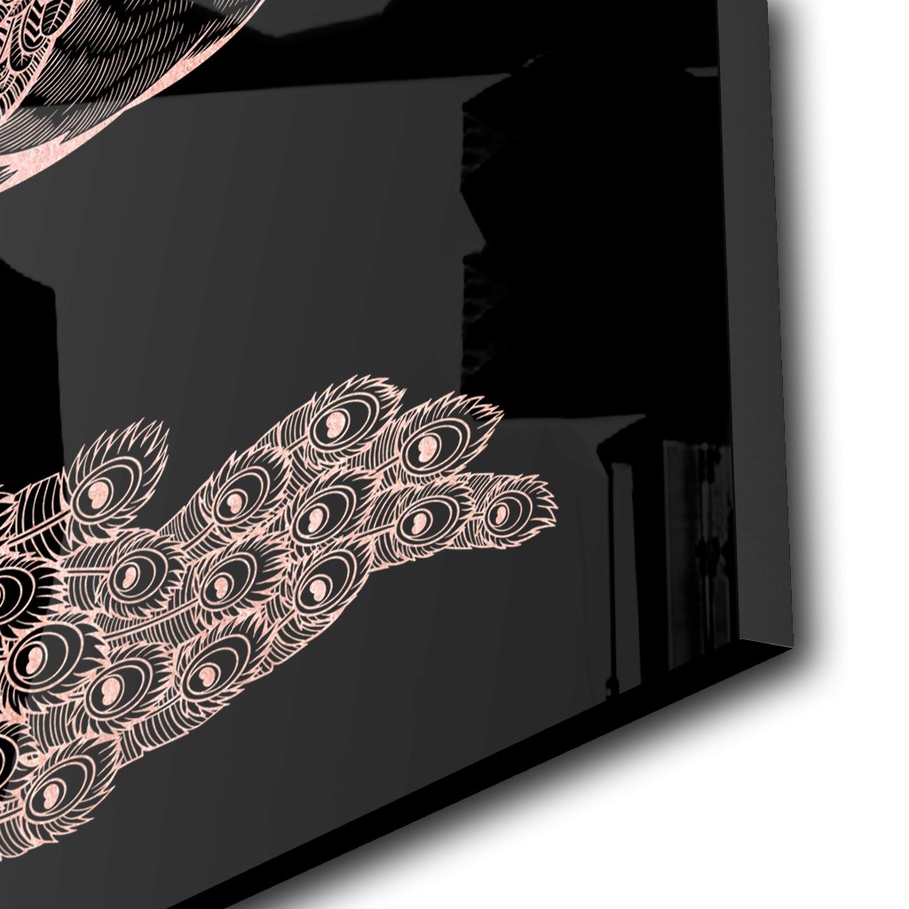 Ein echter Hingucker, der jeden Raum aufwertet. Der Pfau ist ein imposanter und edler Vogel, der durch seine wallenden Schwanzfedern und das echte Roségold, von Hand aufgelegt, besonders beeindruckt.