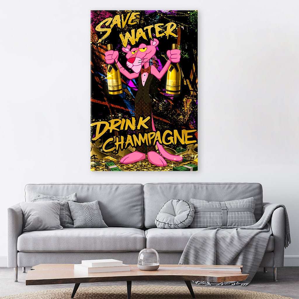 Dieses Motiv zeigt Tom und Jerry in einer humorvollen, ironischen Darstellung. Tom trägt einen Anzug und hält Champagnerflaschen jubelnd nach oben. Die Botschaft "Save Water, Drink Champagne" steht in Rot im Vordergrund des in dezenten warmen Farbtönen gestaltetem Motiv.