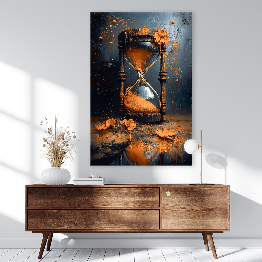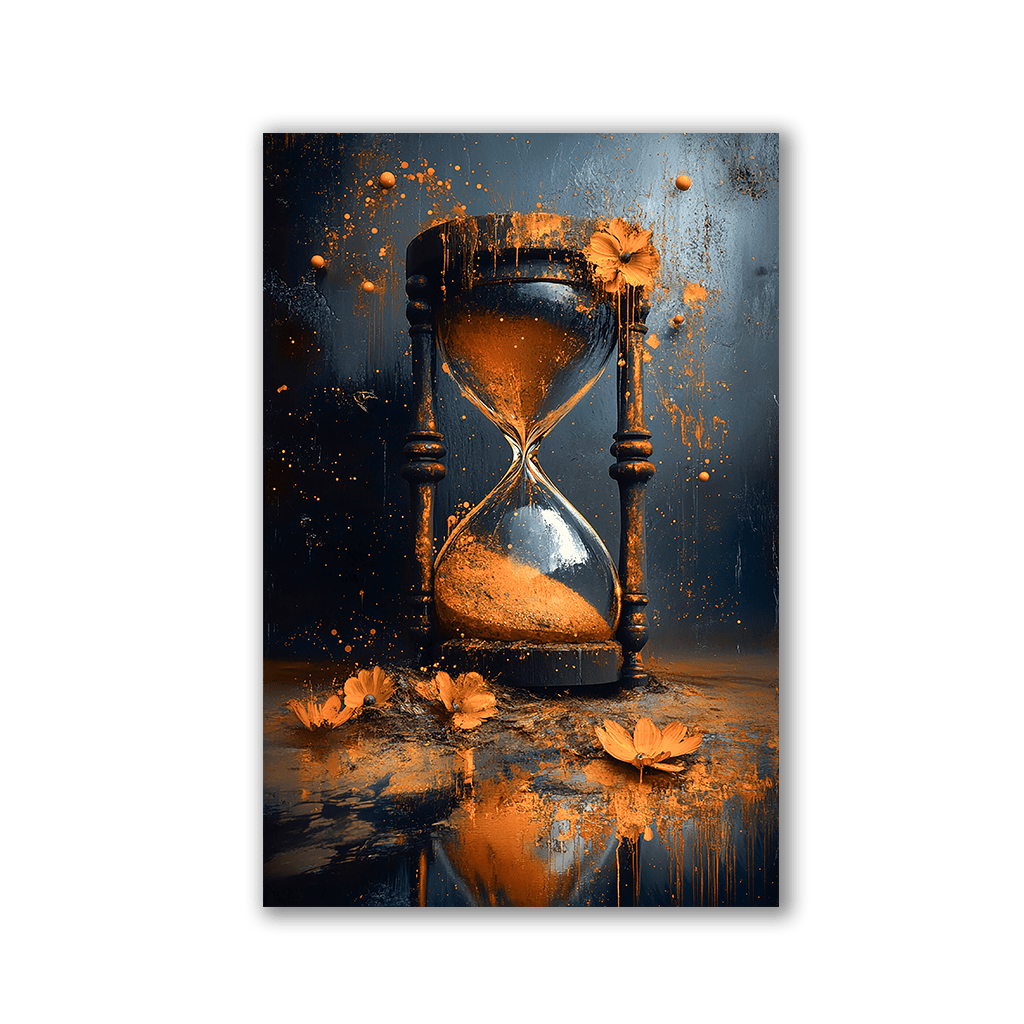 Dieses fesselnde Bild zeigt eine Sanduhr in einem surrealen Ambiente. Die Sanduhr ist das zentrale Element, dessen Sand in einem warmen Orangeton fließt. Um die Sanduhr herum sind Blütenblätter derselben Farbe, die einen Hauch von Magie und Vergänglichkeit vermitteln. Der Hintergrund ist dunkel und strukturiert, was einen starken Kontrast zu den leuchtenden Farben der Sanduhr und der umgebenden Elemente bildet.