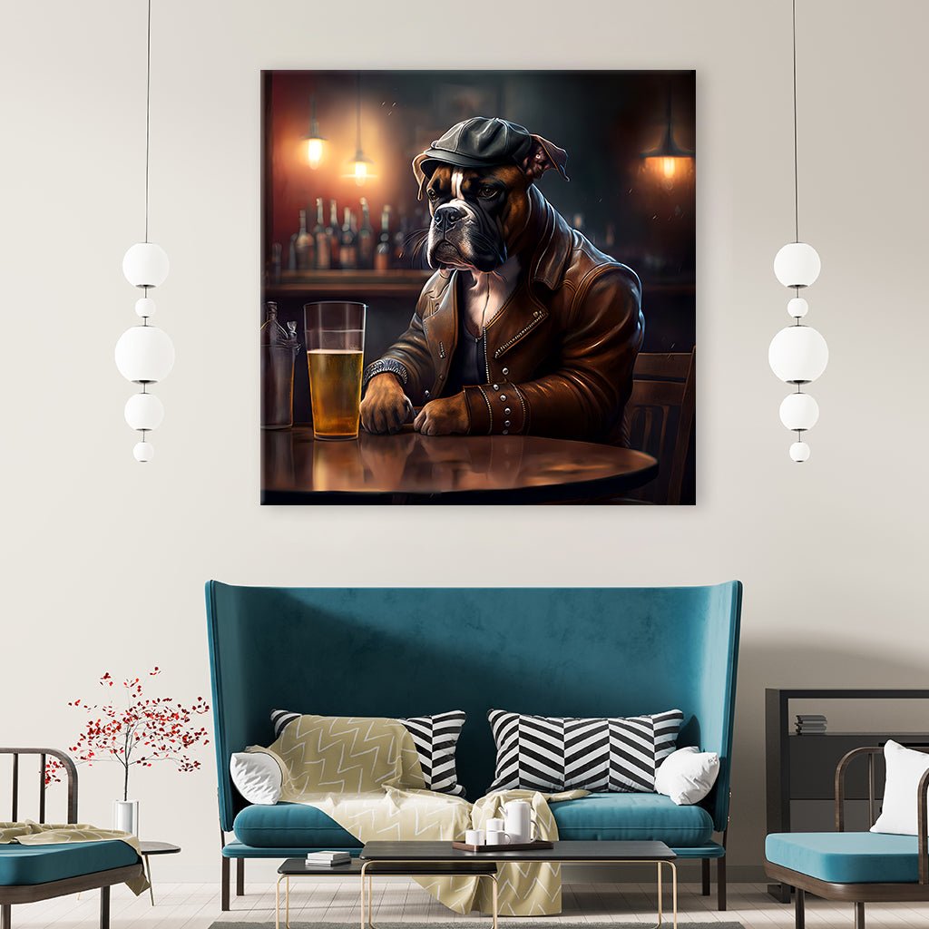 In einer tierischen Bar sitzt ein Boxer in einem coolen Lederoutfit und mit Schiebermütze an einem Tisch und genießt ein Glas Bier. Die stimmungsvolle Lichtgestaltung unterstreicht die Atmosphäre dieser ungewöhnlichen Szene. Ein ausgefallenes Motiv, das den außergewöhnlichen Barbesuch eines tierischen Gastes im typischen Charme einer Bar in dein Zimmer bringt.