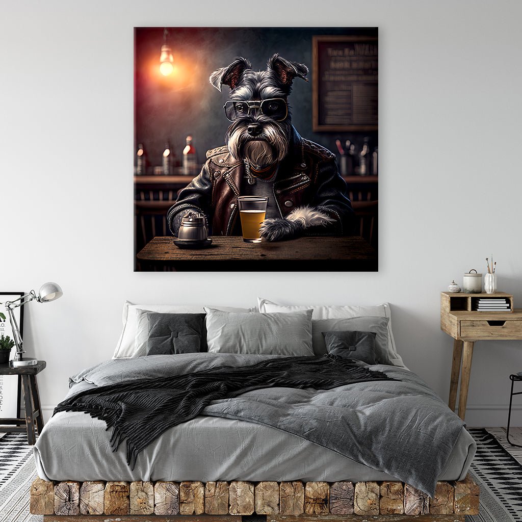 In einer tierischen Bar sitzt ein Schnauzer bekleidet mit einer Lederjacke und großer Brille am Tisch und genießt ein Bier. Die stimmungsvolle Lichtgestaltung unterstreicht die Atmosphäre dieser ungewöhnlichen Szene. Ein ausgefallenes Motiv, das den außergewöhnlichen Barbesuch eines tierischen Gastes im typischen Charme einer Bar in dein Zimmer bringt.