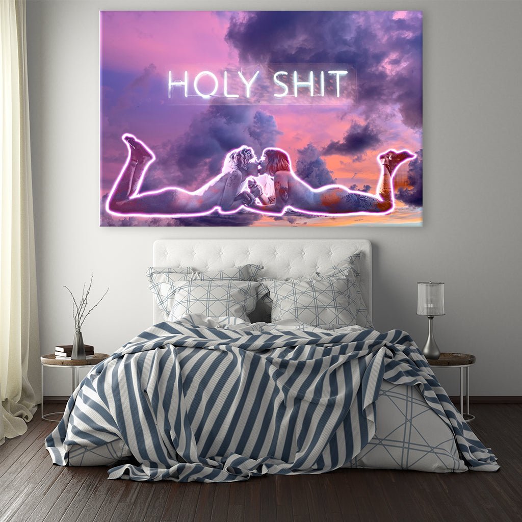 Heilige Schei... Das wird der Ein oder Andere denken, wenn er dieses Bild mit den beiden küssenden Frauen sieht. Als Überschrift im Neonstil steht "Holy shit" und im Hintergrund lila Wolken. Es ist ein außergewöhnlicher Hingucker für dein Schlafzimmer, Wohnzimmer, Büro oder Flur.