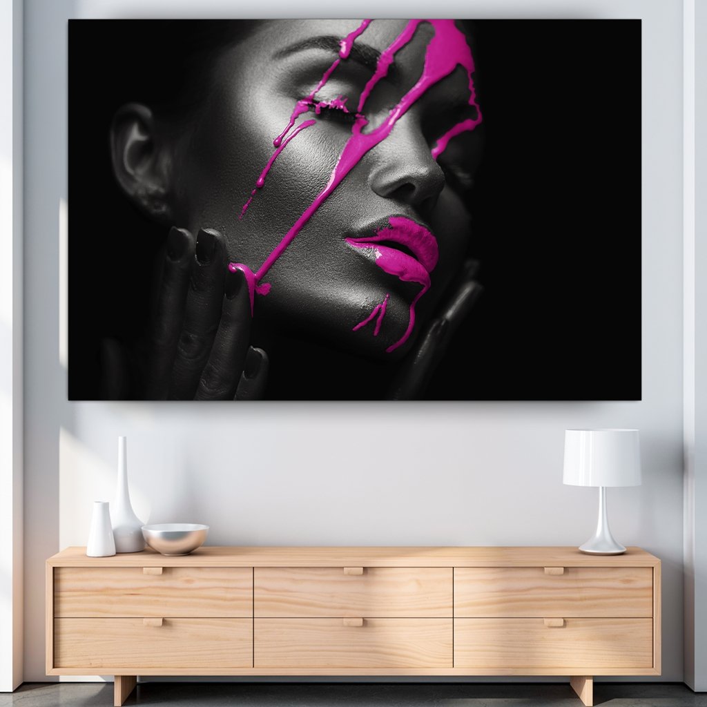 Zweideutig und dennoch viel sagend. Mit der lilanen Flüssigkeit auf ihren Lippen und ihrer Haut ist unsere Dame ein wahrer Blickfang und perfekt um mal kurz die Gedanken schweifen zu lassen. Ideal für dein Wohnzimmer, Schlafzimmer oder Flur.