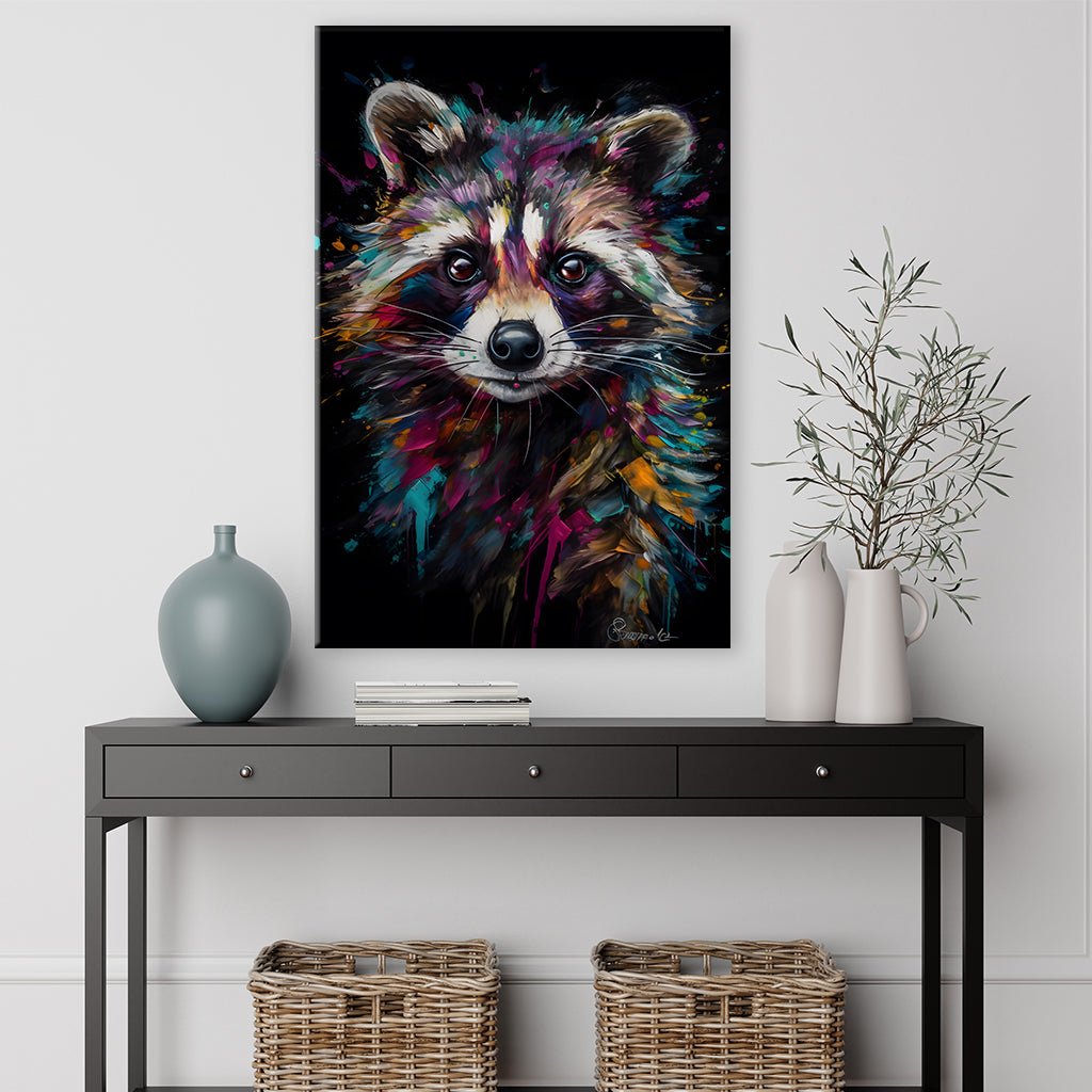 Viele kleine bunte Farbkleckse und Striche ergeben diesen süßen Waschbären, das auf einem schwarzen Hintergrund zu sehen ist. Die vielen kleinen Farbkleckse ergeben ein einzigartiges Kunstwerk, das die Schönheit der Dame und die Kreativität des Künstlers auf wunderbare Weise vereint.