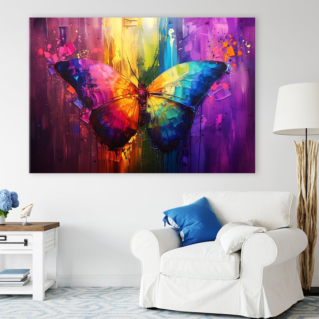Das Motiv zeigt einen eindrucksvollen Schmetterling im Stil von gemaltem Acryl, leuchtend in kräftigen Regenbogenfarben. Der Schmetterling, der zentral im Bild positioniert ist, fängt sofort die Aufmerksamkeit des Betrachters ein. Seine Flügel erstrecken sich majestätisch und zeigen ein lebendiges Spektrum an Farben, die von Rot und Orange bis zu Blau und Violett reichen, kunstvoll ineinander übergehend.