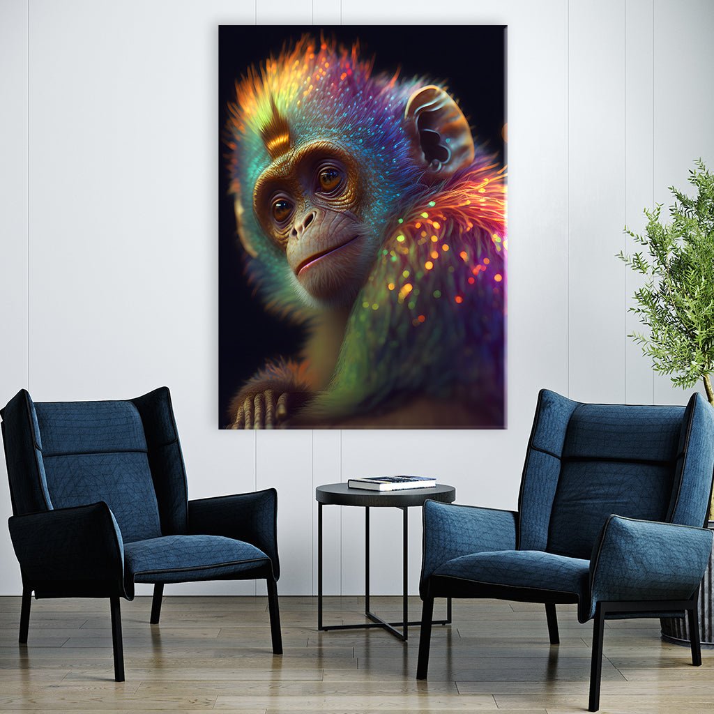 Der kleine Affe ist ein wahrer Blickfang mit seinem bunten Fell in Regenbogenfarben, das im Licht funkelt wie kleine Sterne. Mit seinem niedlichen Aussehen erobert er jedes Herz im Sturm.