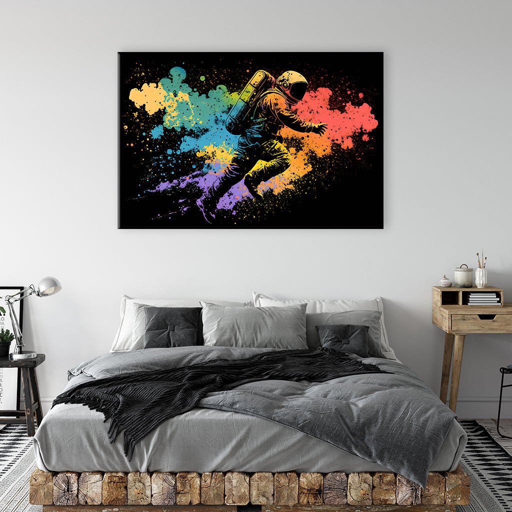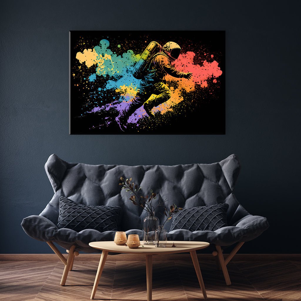 Découvrez les limites de l'espace avec cette œuvre d'art impressionnante représentant un astronaute flottant dans les vastes étendues de l'univers. Le fond noir et les couleurs vives créent un contraste saisissant qui attire le regard et stimule l'imagination.