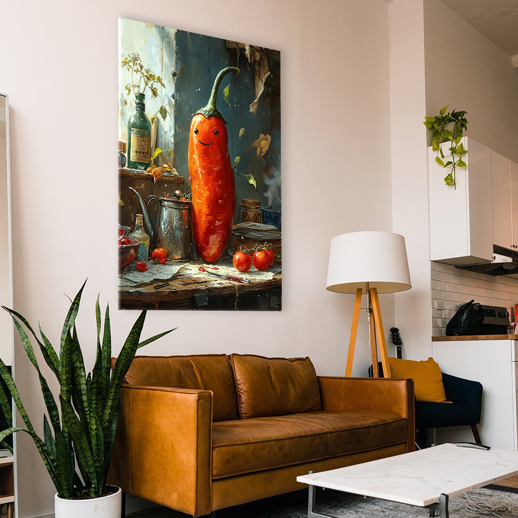 Die Szene zeigt eine niedliche Darstellung einer roten Chili mit einem lächelnden Gesicht, die auf einer Küchenarbeitsfläche steht. Um sie herum liegen Tomaten, Geschirr und eine Gießkanne, die die Szene gemütlich und heimisch machen.