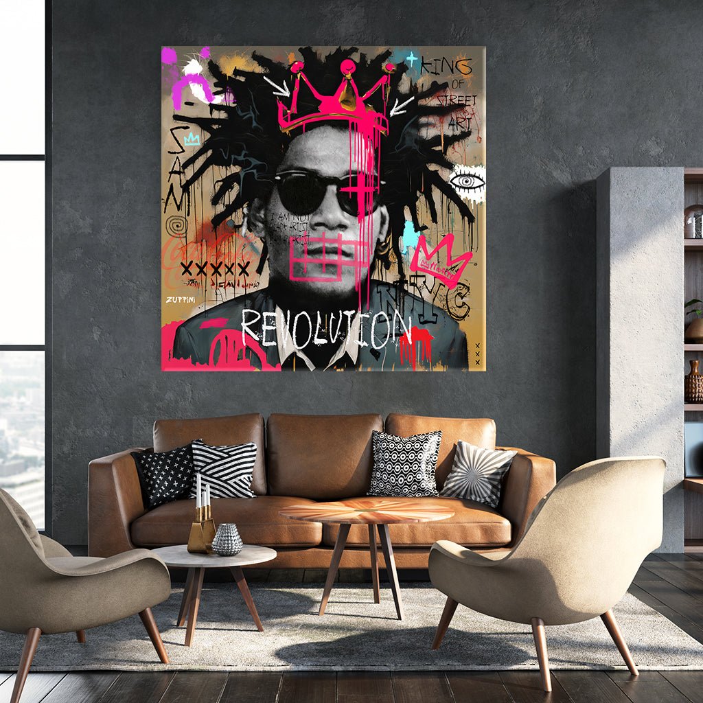 Das Bild zeigt ein stilisiertes Porträt von Jean-Michel Basquiat mit Sonnenbrille und seiner charakteristischen Frisur, überlagert von einer auffälligen pinken Krone und anderen Graffiti-Elementen. Schriftzüge wie "KING OF STREET ART" und "REVOLUTION" sind prominent platziert. Die Komposition ist eine Hommage an den Künstler und seine Bedeutung für die Street Art, mit einer Mischung aus Schwarz-Weiß-Darstellung und lebhaften Farben.