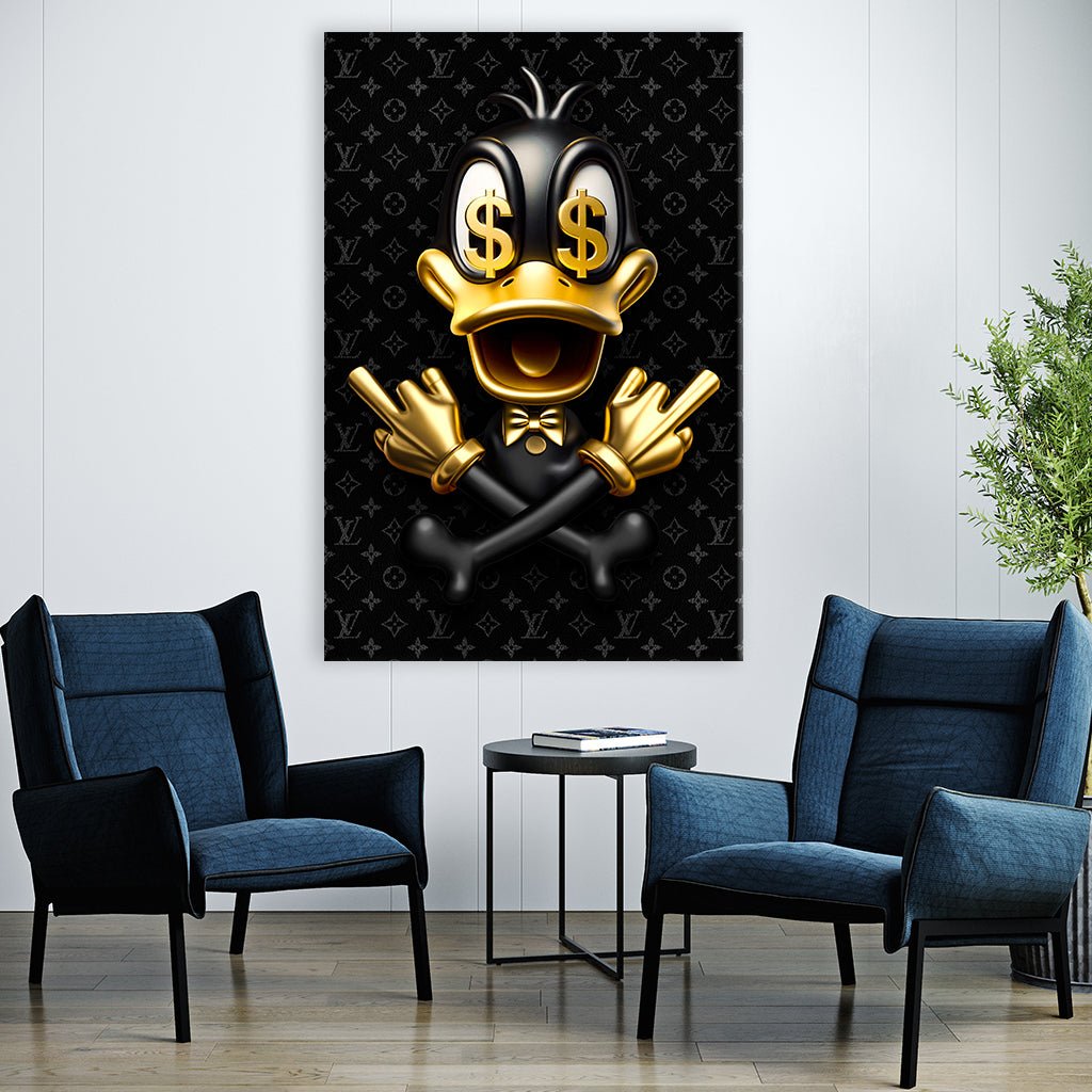 Das Bild zeigt eine stilisierte, humorvolle Darstellung einer ikonischen Ente in Schwarz und Gold. Die Figur trägt goldene Handschuhe und eine goldene Fliege, und ihre Augen sind durch goldene Dollarzeichen ersetzt. Die Hände der Figur zeigen eine provokante Geste mit erhobenen Mittelfingern. Der Hintergrund ist schwarz mit wiederkehrenden Logos der Marke Louis Vuitton. Insgesamt vermittelt das Bild eine satirische und luxusorientierte Ästhetik.