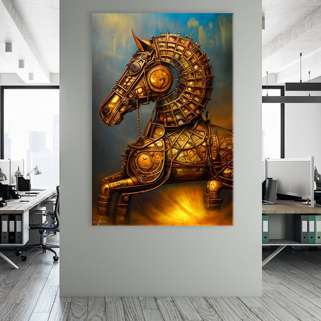 Dieses außergewöhnliche Motiv entführt dich in die surreale Welt des Steampunk-Stils, in der ein majestätisches Pferd im Mittelpunkt steht. Das Pferd ist komplett aus goldenem Metall gefertigt und verkörpert eine futuristische Interpretation der klassischen Ästhetik. Die futuristischen Elemente erzeugen eine Mischung aus Vintage- und High-Tech-Designs. Es symbolisiert die Grenzenlosigkeit der Fantasie und eröffnet eine neue Dimension des Staunens und der Inspiration.