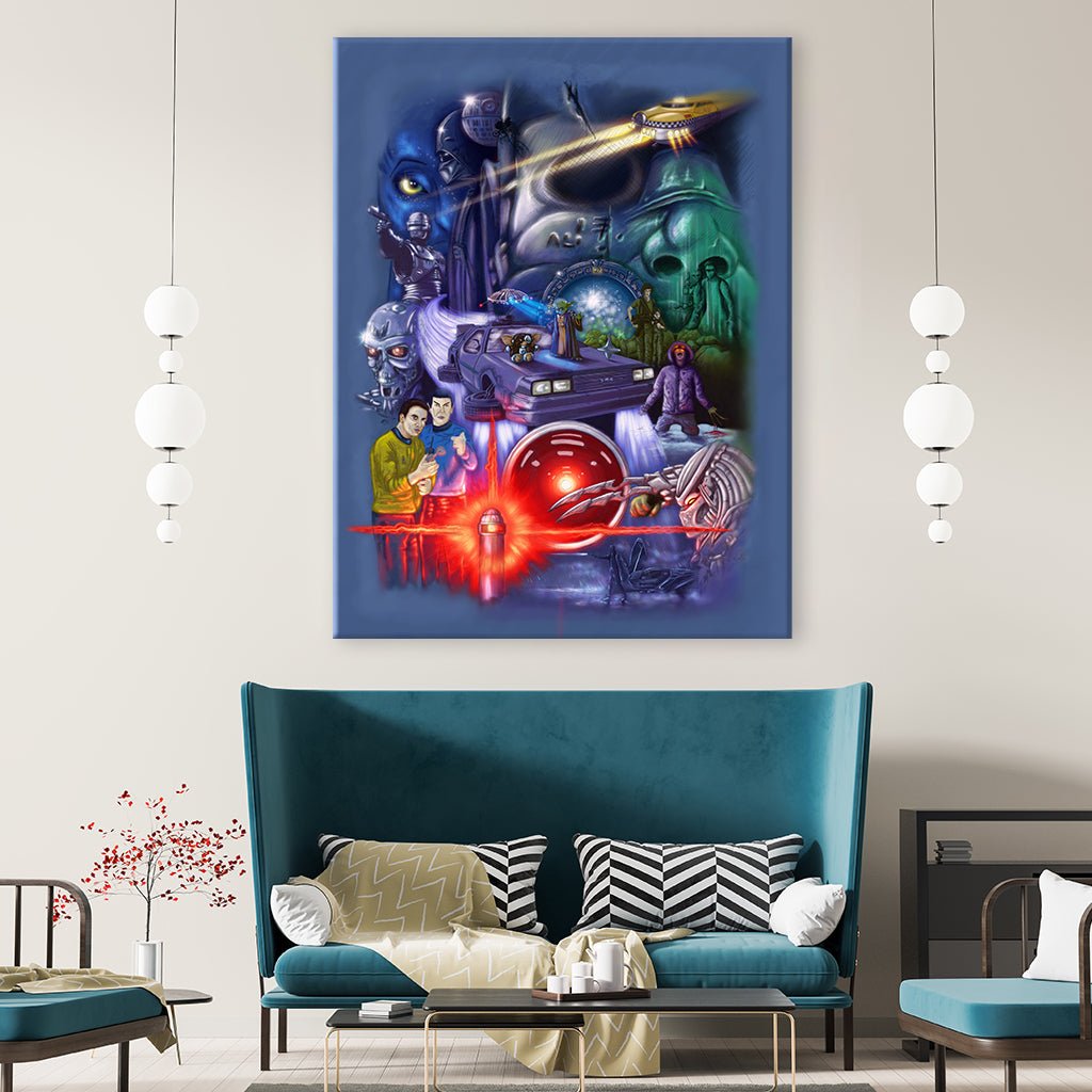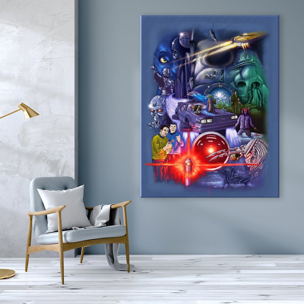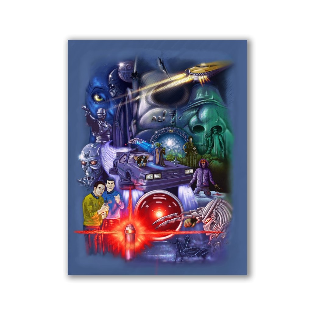 Bekannte Größen aus den den Filmen Avatar, Star Wars, E.T., Terminator sind auf dieser besonderen Collage zu sehen und somit ein toller Blickfang für deine Bilderwand im Wohnzimmer, Schlafzimmer, Flur oder Büro.