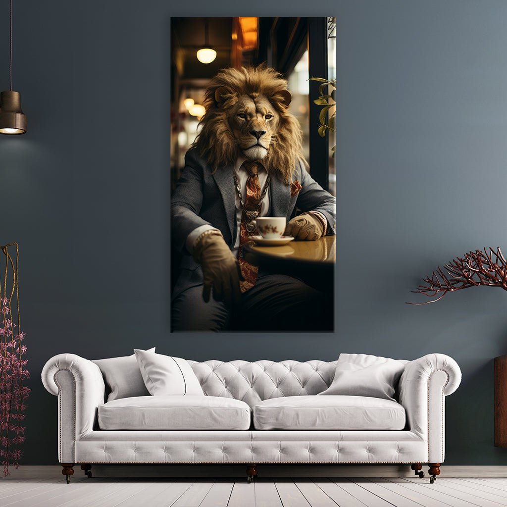 In einem Café, in natürlicher Farbgestaltung, sitzt ein Löwe im Anzug. Das surreale Bild, das die Grenzen zwischen Realität und Fantasie verschwimmen lässt, während der Löwe eine Aura der Souveränität ausstrahlt. Perfekt für dein Wohnzimmer, Schlafzimmer oder Flur.
