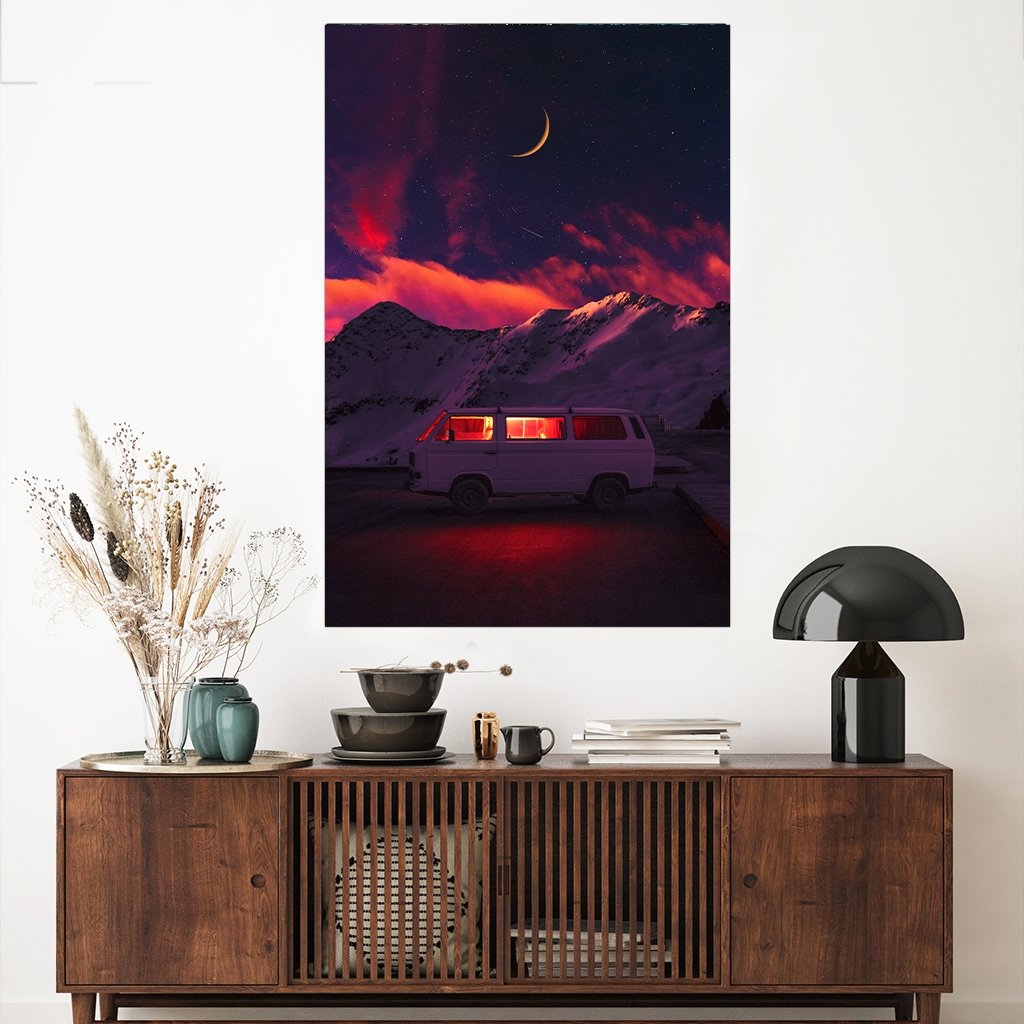 Das Motiv zeigt einen alten, charmanten VW Bully, der Nostalgie und Abenteuerlust ausstrahlt. Der Bully steht vor einer atemberaubenden Kulisse schneebedeckter Berge, die majestätisch in den Hintergrund ragen. Der Himmel präsentiert sich in einem intensiven Abendrot, während die Mondsichel schon am Himmel erstrahlt.