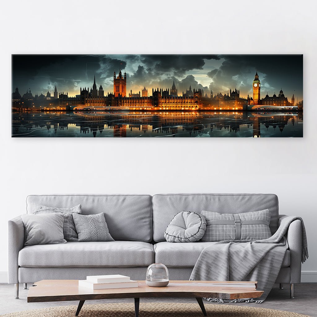 Ein atemberaubendes Panoramabild der Londoner Skyline bei Nacht erfasst die Magie der Stadt. Der Big Ben erstrahlt majestätisch im Dunkeln, während sich die gesamte Stadt im sanften Wasser der Themse spiegelt. Dieses fesselnde Bild einfängt die pulsierende Energie Londons und die ruhige Schönheit des nächtlichen Gewässers. Perfekt für deine Wand im Wohnzimmer, Schlafzimmer oder deinem Flur.