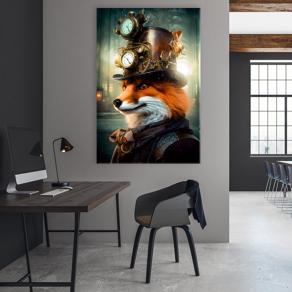 L'image représente un renard élégamment vêtu, arborant une tenue steampunk avec un grand chapeau haut-de-forme en cuir. Notre renard steampunk est parfait pour ceux qui recherchent une image originale et accrocheuse. Avec ses éléments steampunk typiques et son style industriel, cette image est un véritable atout visuel.
