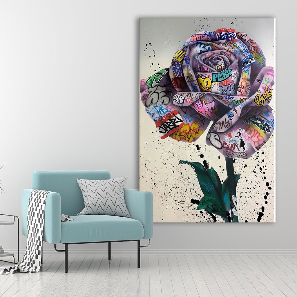 Le motif représente une rose sur les pétales de laquelle sont apposés des graffitis artistiques, notamment des inscriptions et des motifs de Bansky. L'arrière-plan est un dégradé de gris qui s'assombrit légèrement du bas vers le haut et est parsemé d'éclaboussures de peinture noire.
