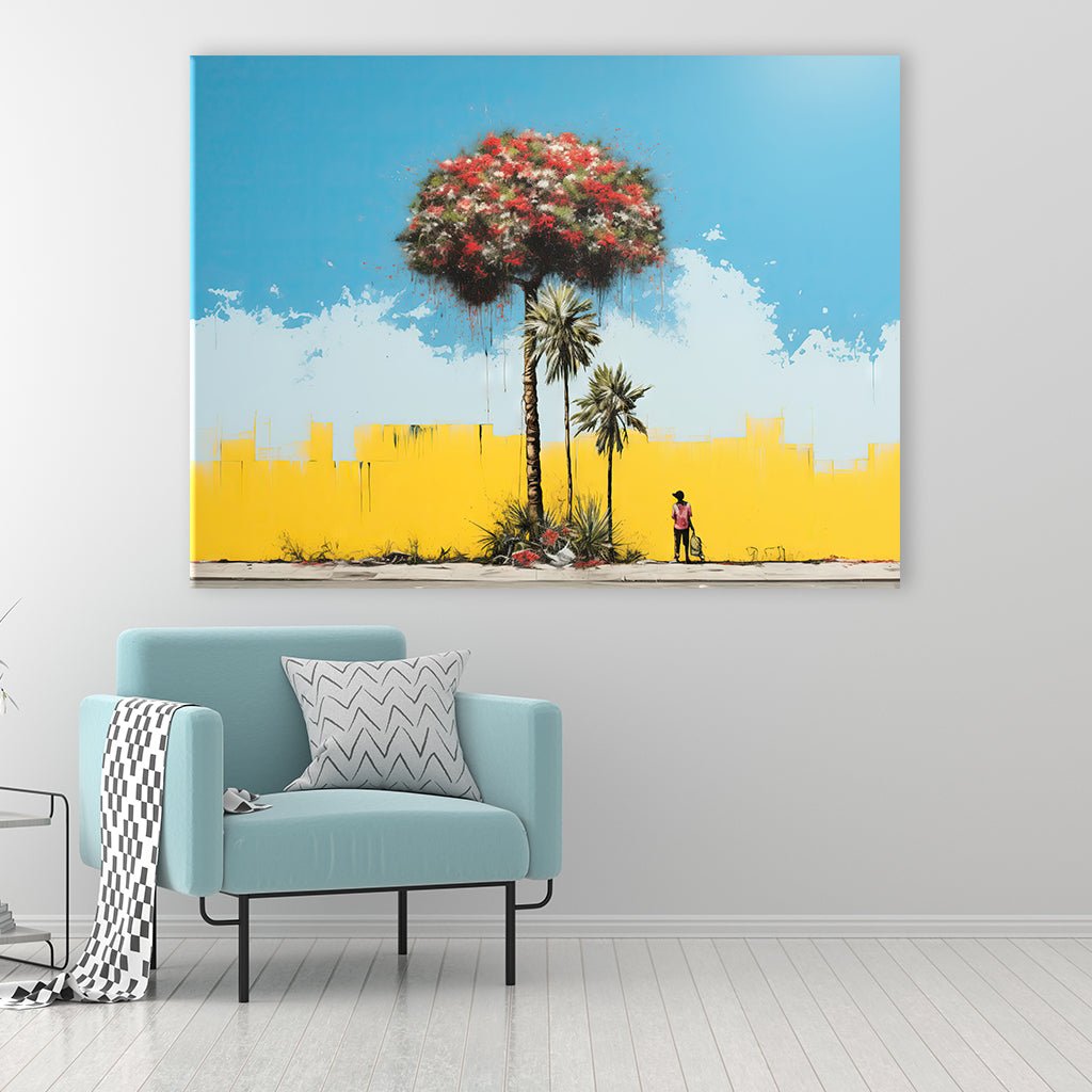 Das Streetart-Motiv präsentiert eine atemberaubende Kulisse: Eine imposante Wand, kunstvoll gestaltet in Gelb und Blau, bildet den Hintergrund und erweckt die Illusion eines endlosen Strandes. In der Mitte der Wand erhebt sich ein hoher, prächtig blühender Baum, der seine Schönheit stolz zur Schau stellt. Zu seinen Seiten stehen zwei kleinere Palmen, die dem Bild eine tropische Note verleihen. Am Fuße der Bäume steht eine einsame Gestalt.
