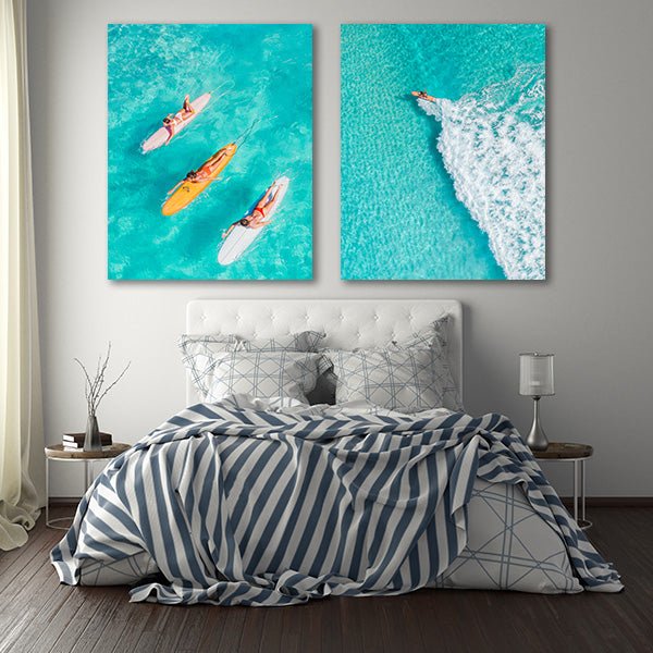 Surfen ist ein anstrengende und dennoch atemberaubend schöne Sportart. Durch meterhohe Wollen surfen oder einfach entspannt auf dem Surfbrett übers Meer paddeln. So wie die Damen auf unserem Motiv mit türkisblauem Merr unter ihnen.