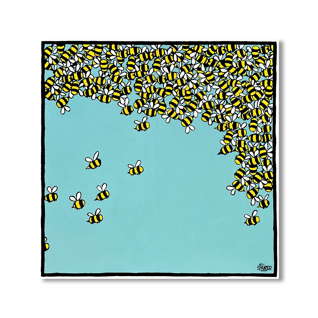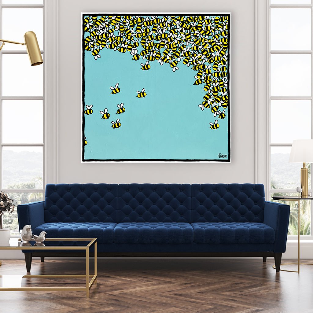 Dieses tolle und farblich freundlich gestaltete Bild zeigt wie ein Schwarm Bienen an einem für sie perfekten Tag aufbrechen, um zu summen und die Blumen zu bestäuben. Genieße dieses Bild und lass ein wenig Sonnenschein in deinen Raum einziehen. Perfekt um auch an trüben Tagen frohen Mutes zu sein.
