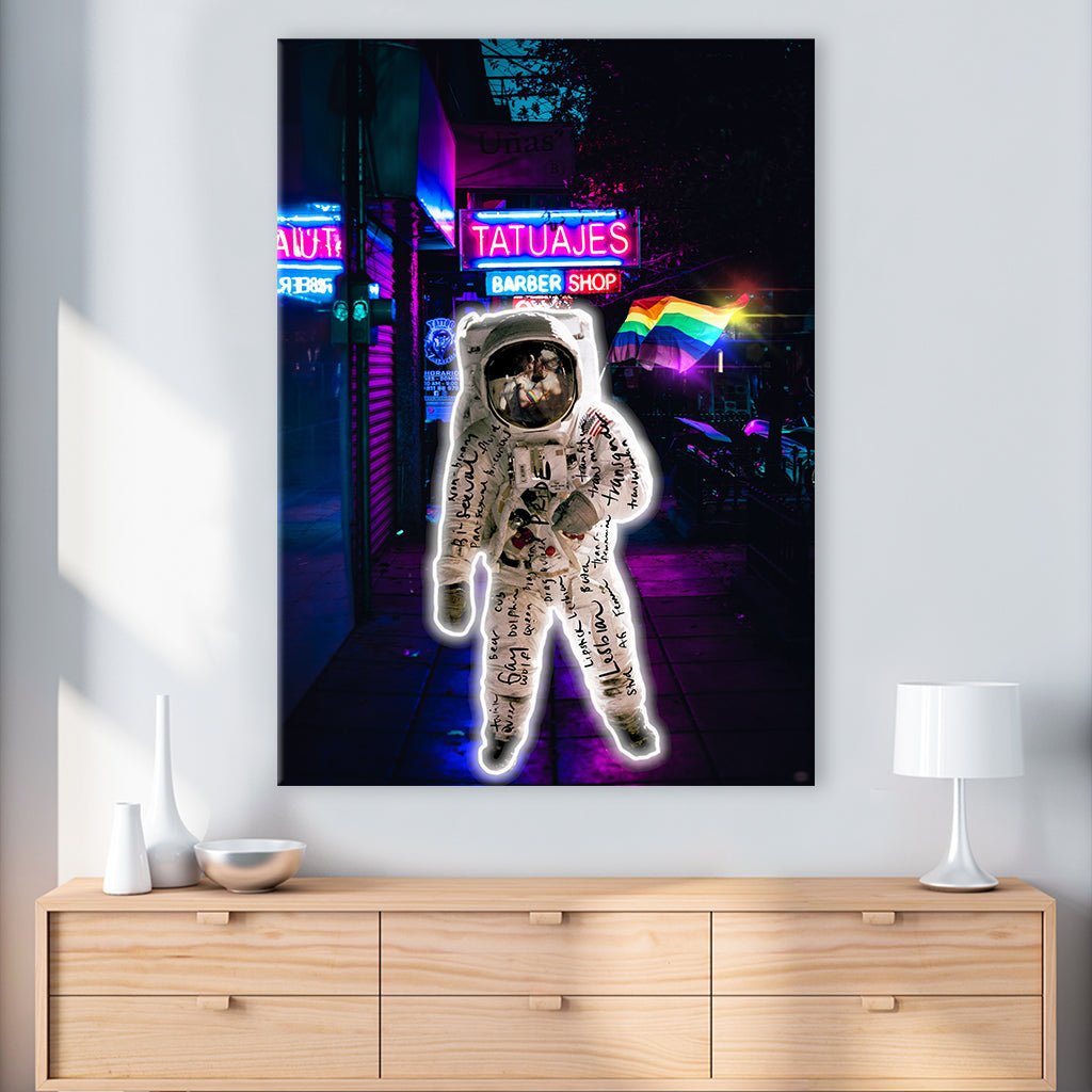 Ein Astronaut der aus einem Tattoostudio kommt. Sein kompletter Anzug tattowiert mit Worten wie "lesbian", "gay" und vielen mehr.Im Hintergrund die Flagge der LGBTQI-Gemeinschaft die als Symbol für Vielfalt, Stolz und Selbstbehauptung steht. Hervorgehoben im Neonstil ist dieses Bild ein außergewöhnlicher Hingucker für dein Schlafzimmer, Wohnzimmer, Büro oder Flur.