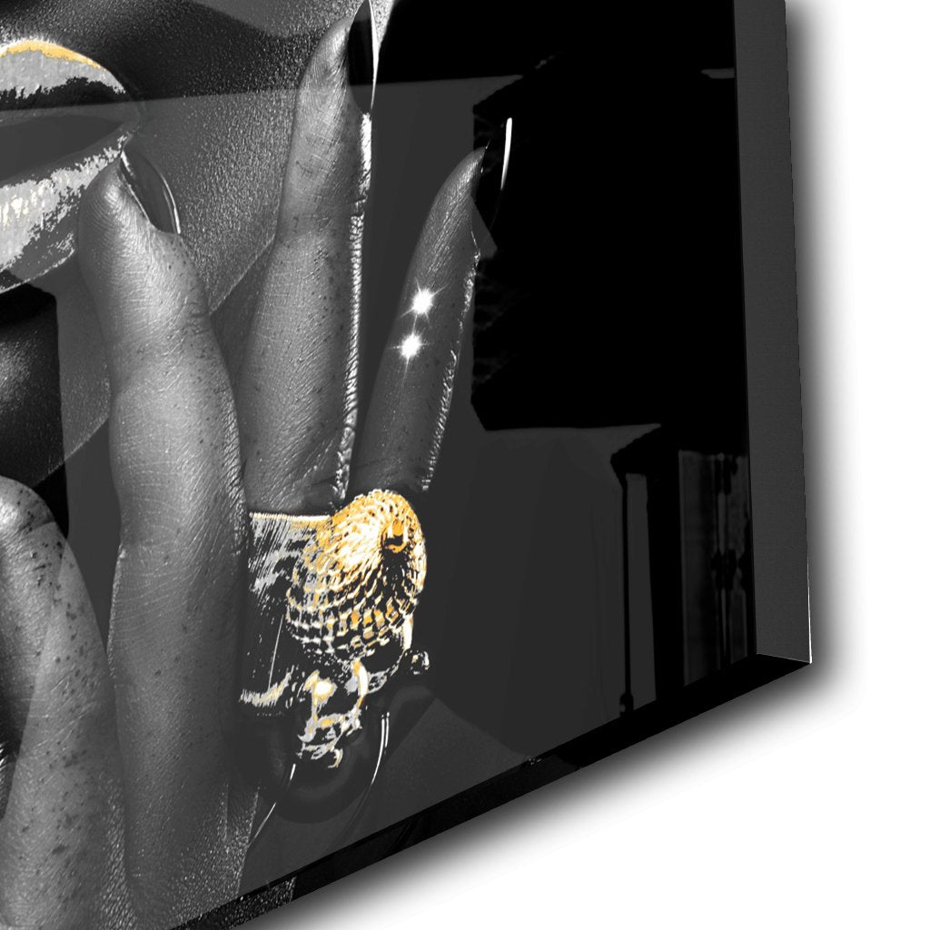 Die Silber Highlights des Motivs sind die silberfarbenen Lippen, Fingernägel und die langen Wimpern unserer Dame die sehr verlockend wirkt. Durch die Verwendung von Acrylglas erhält das Bild eine Hochglanz-Oberfläche, die für eine atemberaubende Farbbrillianz und faszinierende Tiefenwirkung sorgt.